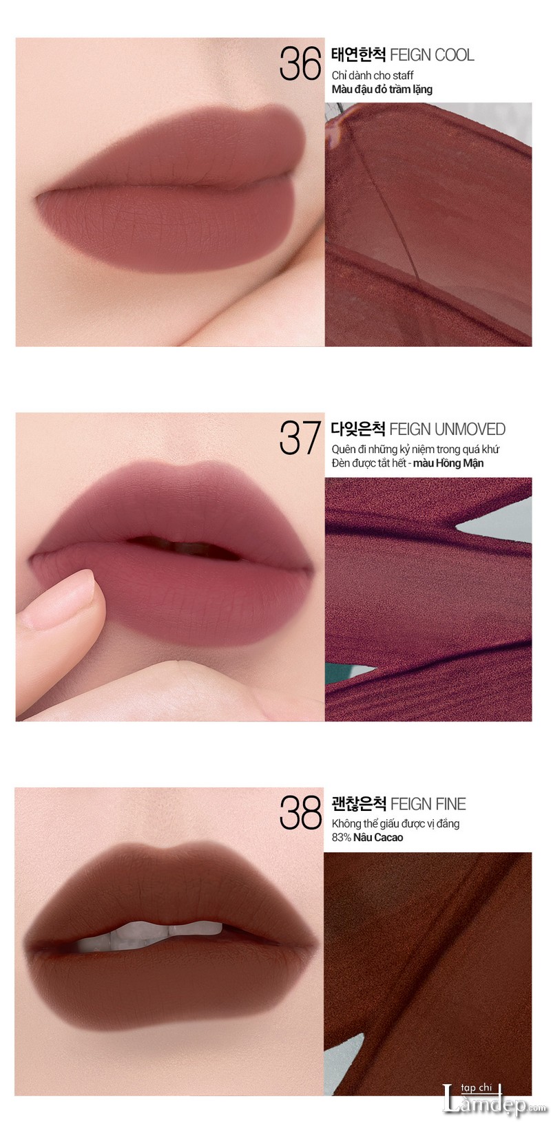 - Màu 38: Feign Fine là màu nâu Socola trầm đậm – màu son Hot trend đáng sở hữu nhất, Best Seller của Ver 8, màu son không lẫn ánh đỏ nhưng rất ngầu và thuộc tone ấm nên phù hợp với da Châu Á. Màu son không kén tone da nhưng các nàng nên trang điểm đi kèm để xinh hơn nhé!