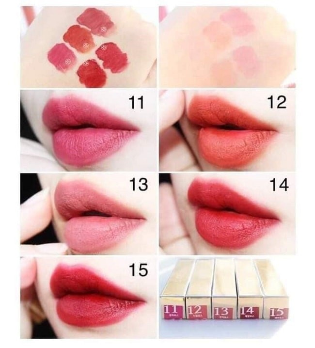 - Màu 11: Calm Boss là một màu hồng đỏ đất nhưng ngả nhiều về sắc hồng hơn. Màu son này nếu dùng đánh lòng môi sẽ khiến gương mặt bạn sáng bừng lên, trẻ trung và khá dễ thương nên được nhiều các bạn học sinh, sinh viên lựa chọn.