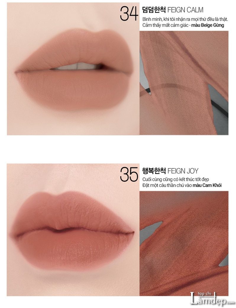 - Màu 34: Feign Calm là màu nâu nude, màu son này không kén tone da nhưng cảm giác hơi xỉn men răng. Vì vậy khi lựa chọn màu son này các bạn nên kết hợp make up kiểu hơi tây sẽ phù hợp hơn.