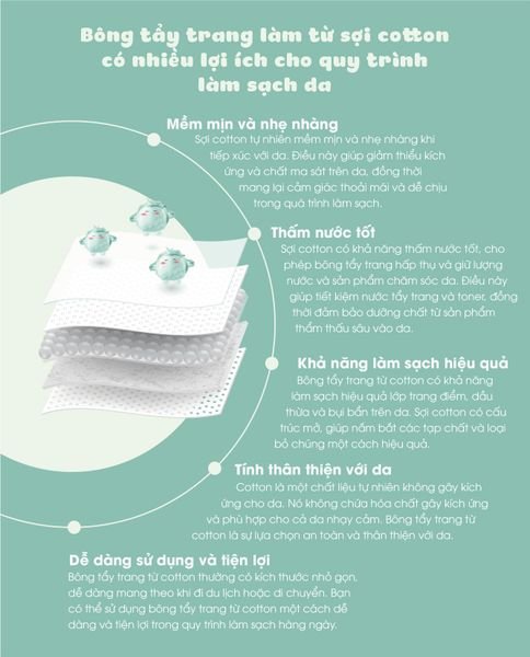 - Bông hình chữ nhật với đường dập cố định hai mép, miếng bông được dệt 2 mặt tiện lợi để sử dụng nước tẩy trang và nước hoa hồng một cách dễ dàng.