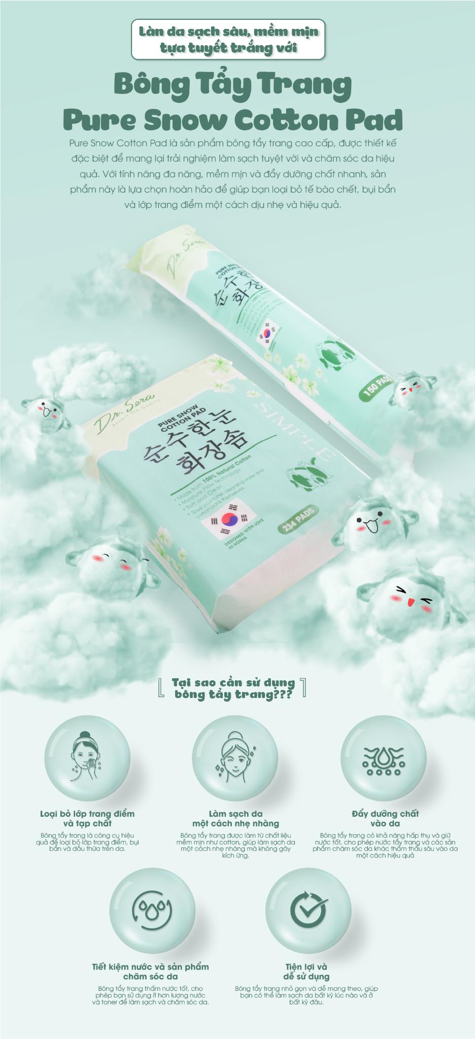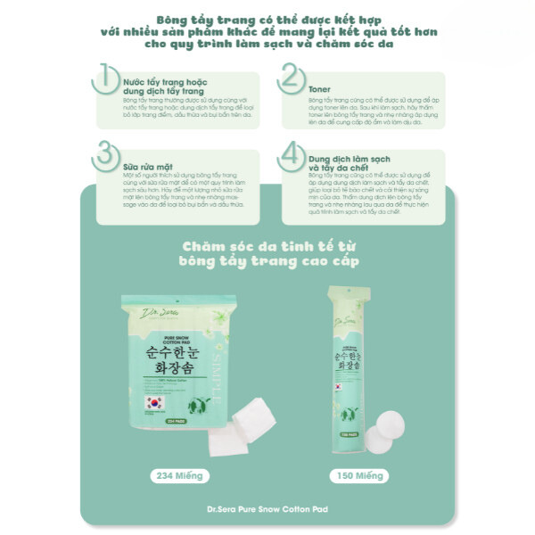 - Bông Tẩy Trang Dr.Sera Pure Snow Cotton Pad được dệt từ những sợi tơ bông nguyên chất 100% cotton tự nhiên mềm mại, an toàn cho da.