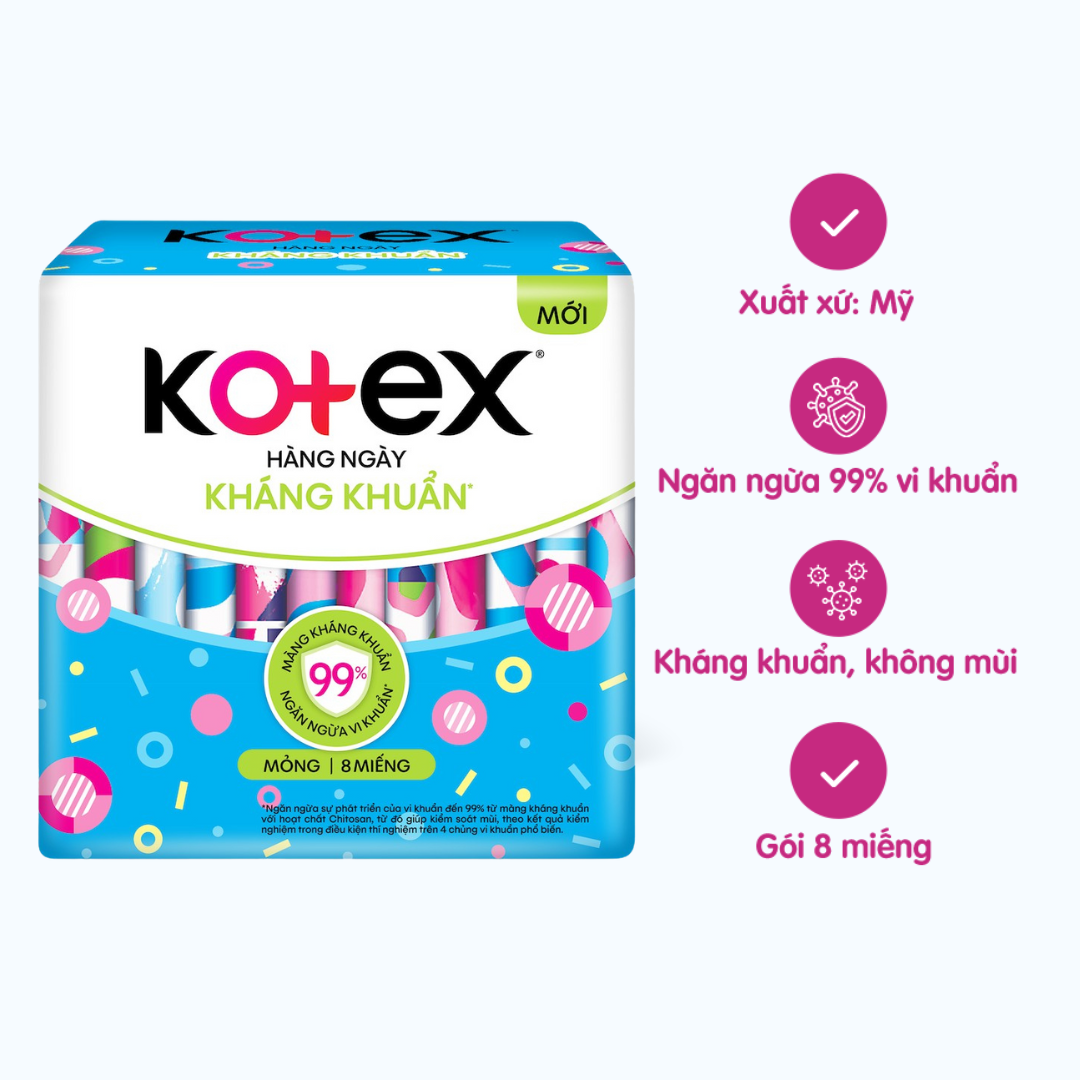 - Băng vệ sinh Kotex kháng khuẩn hàng ngày tăng cường vượt trội với yếu tố kháng khuẩn được kiểm chứng giúp ngăn ngừa sự phát triển của 3 tác nhân: mùi hôi, vi khuẩn và vi nấm có hại.