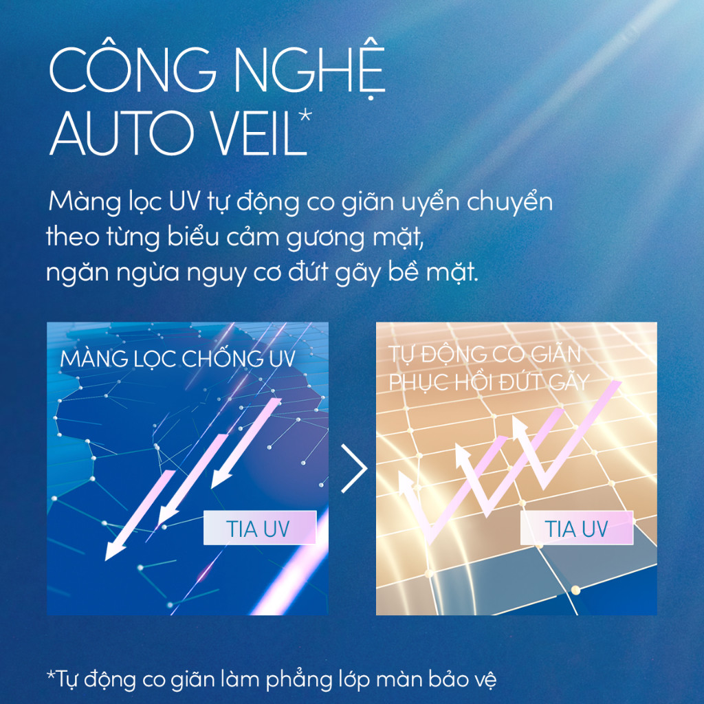 - Công nghệ độc quyền Auto Veil: Bảo vệ da trước mọi tác động nhờ chống đứt gãy màng lọc UV do chuyển động da của biểu cảm gương mặt.