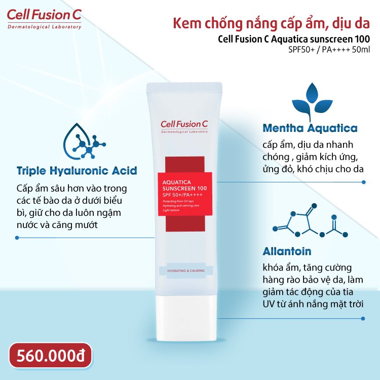 Kem Chống Nắng Cell Fusion C Aquatica Sunscreen 100 SPF 50+/PA++++ là kem chống nắng thuộc thương hiệu dược mỹ phẩm Céll Fúsion C. Là sản phẩm chống nắng dành cho da thiên khô, hỗn hợp thiên khô và da nhạy cảm. Có thành phần cấp ẩm sâu giúp da mịn căng bóng tức thì kết hợp với thành phần giúp ngăn ngừa lão hóa da hiệu quả. Với màng lọc chống nắng SPF 50+/PA++++ vượt trội.