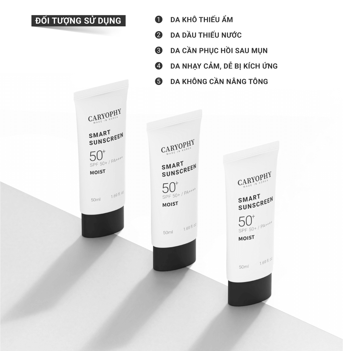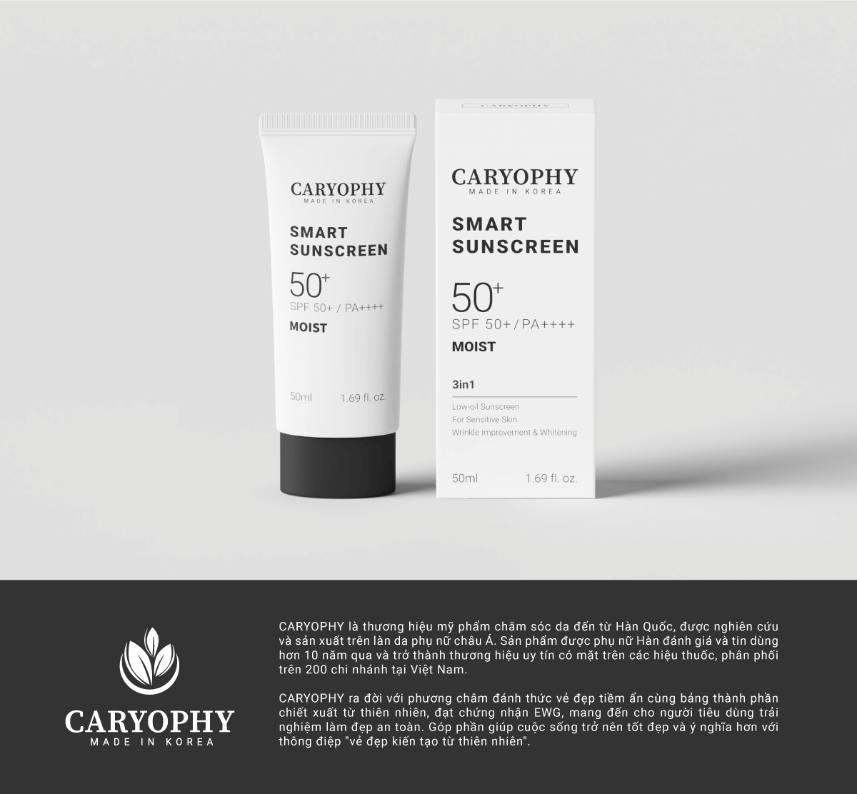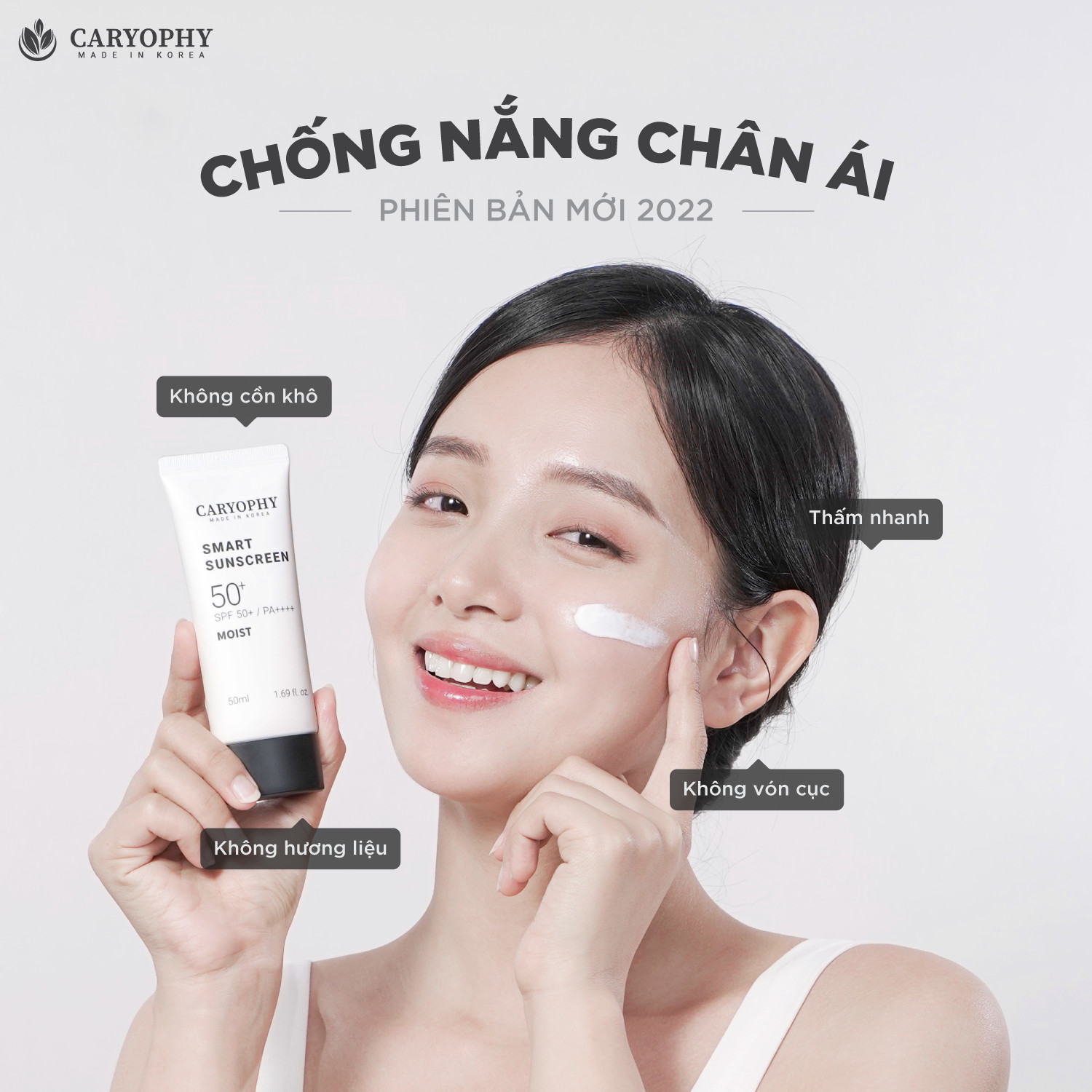 - Kem Chống Nắng Dưỡng Ẩm, Ngừa Mụn Caryophy Smart Moist Sunscreen 50ml có hiệu quả chống nắng mạnh mẽ, bảo vệ da trước tia UVB, UVA , tia hồng ngoại và cả ánh sáng xanh dưỡng da đều màu, sáng khỏe.