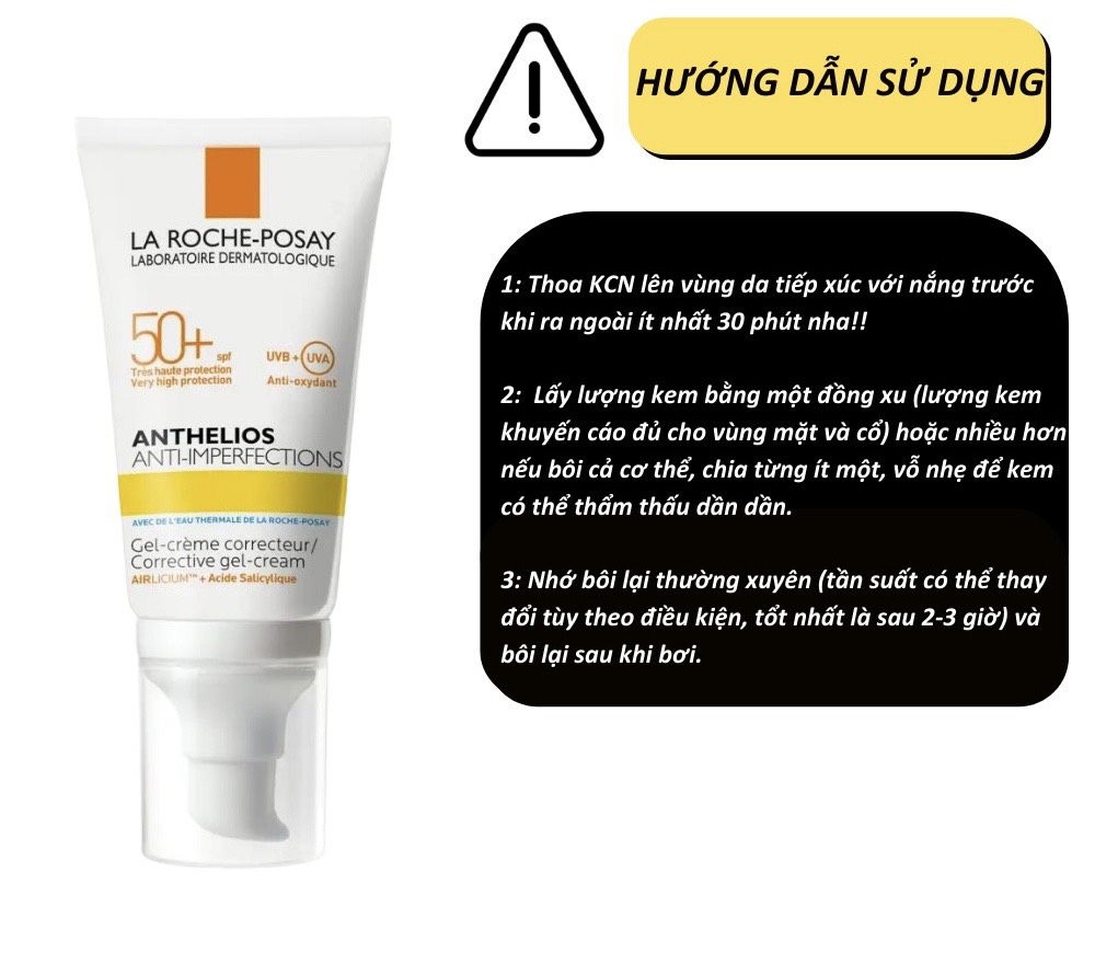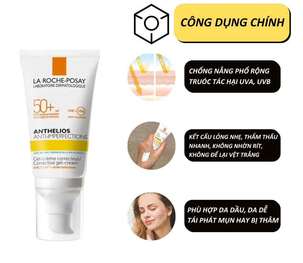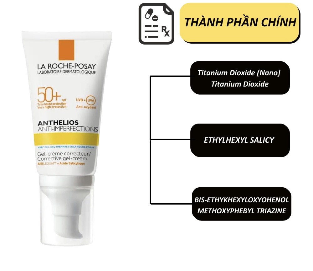 Kem Chống Nắng Giảm Mụn, Kiểm Soát Dầu La Roche-Posay Anthelios Anti-Imperfections SPF50+ là kem chống nắng một sản phẩm kem chống nắng đặc biệt có chứa thành phần Salicylic Acid và Niacinamide, giúp giảm tình trạng mụn trên da. Công thức này với màng lọc quang phổ rộng, mang đến khả năng bảo vệ tối ưu khỏi tia UVA, UVB, tia hồng ngoại & ô nhiễm. Đây cũng chính là những tác nhân khiến da dễ bị mụn trứng cá, thâm nám & lão hóa sớm Sản phẩm giúp kiểm soát bóng nhờn và kháng nước thuộc thương hiệu dược mỹ phẩm La Roche-Posay đến từ Pháp.