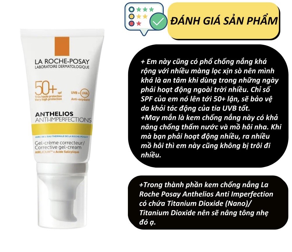 - Kem Chống Nắng Giảm Mụn, Kiểm Soát Dầu La Roche-Posay Anthelios Anti-Imperfections SPF50+ là kem chống nắng chuyên dụng cho làn da gặp các rắc rối liên quan đến mụn như: dễ phát sinh mụn trứng cá do tác động từ Môi trường, vết thâm mụn đậm màu hơn sau khi tiếp xúc với UV, da trở nên nhạy cảm hơn, da dễ kích ứng… Sản phẩm thuộc dòng Chống nắng Anthelios của LRP, sở hữu bộ lọc UV quang phổ rộng XL-Protect với chỉ số chống nắng rất cao: SPFF50 + và UVA-PF 21.