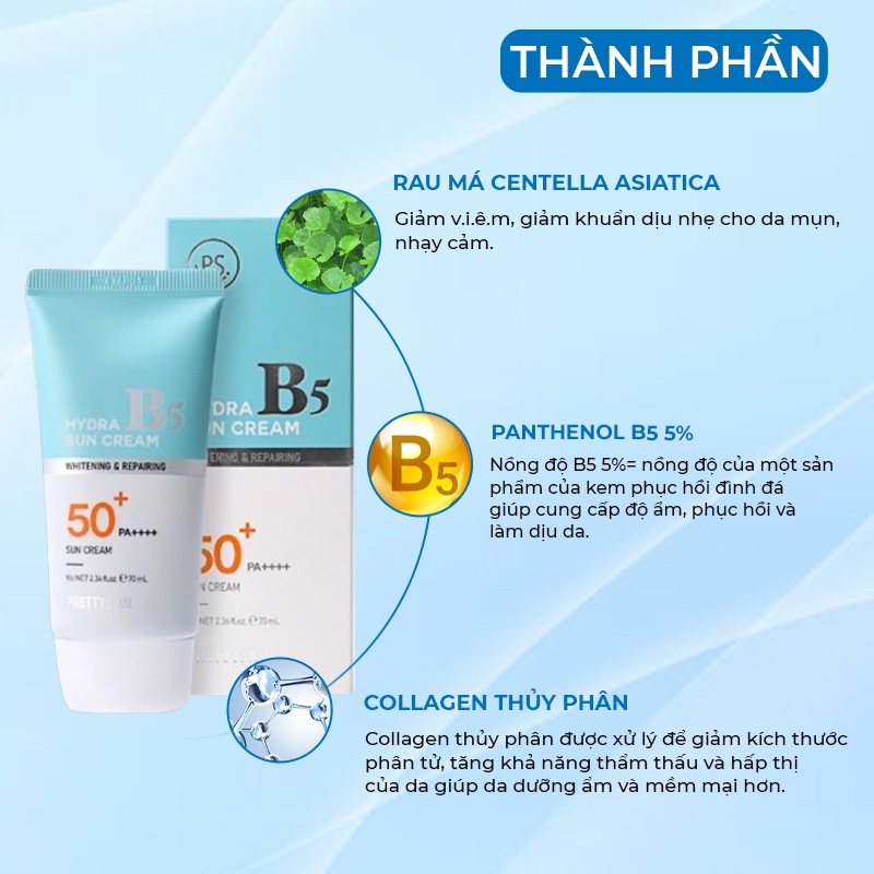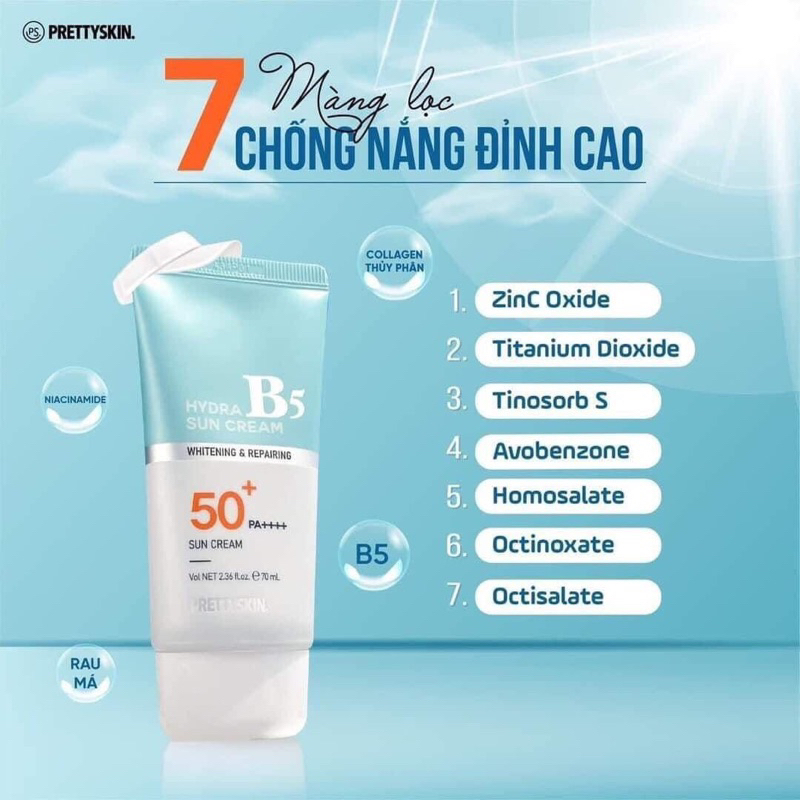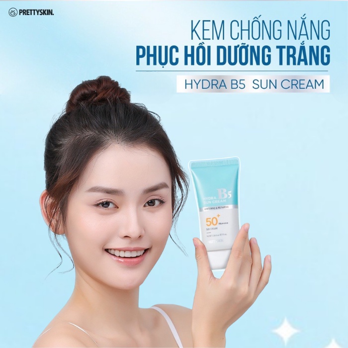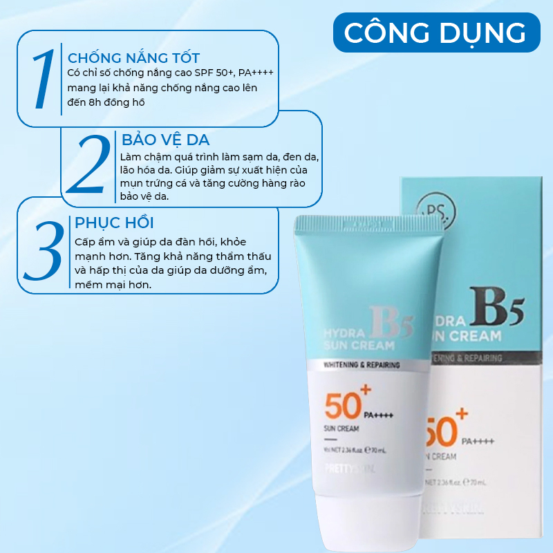 Kem Chống Nắng Phục Hồi Dưỡng Trắng, Chống Lão Hóa Pretty Skin Hydra B5 Sun Cream SPF 50+/PA+++ 70ml là sản phẩm kem chống nắng đến từ thương hiệu Pretty Skin với chỉ số SPF 50+/PA+++. Kem có chứa thành phần B5 giúp dưỡng ẩm, làm mềm và bảo vệ da khỏi tác động của ánh nắng mặt trời. Sản phẩm được thiết kế nhỏ gọn và thuận tiện để mang theo bên mình khi đi ra ngoài.