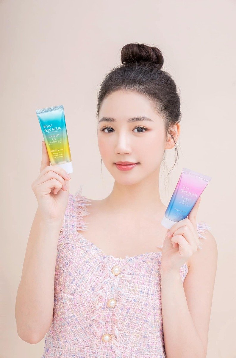 - Sunplay Skin Aqua Tone Up UV Happiness Aura (Rose): dành cho tông da tái xanh.
