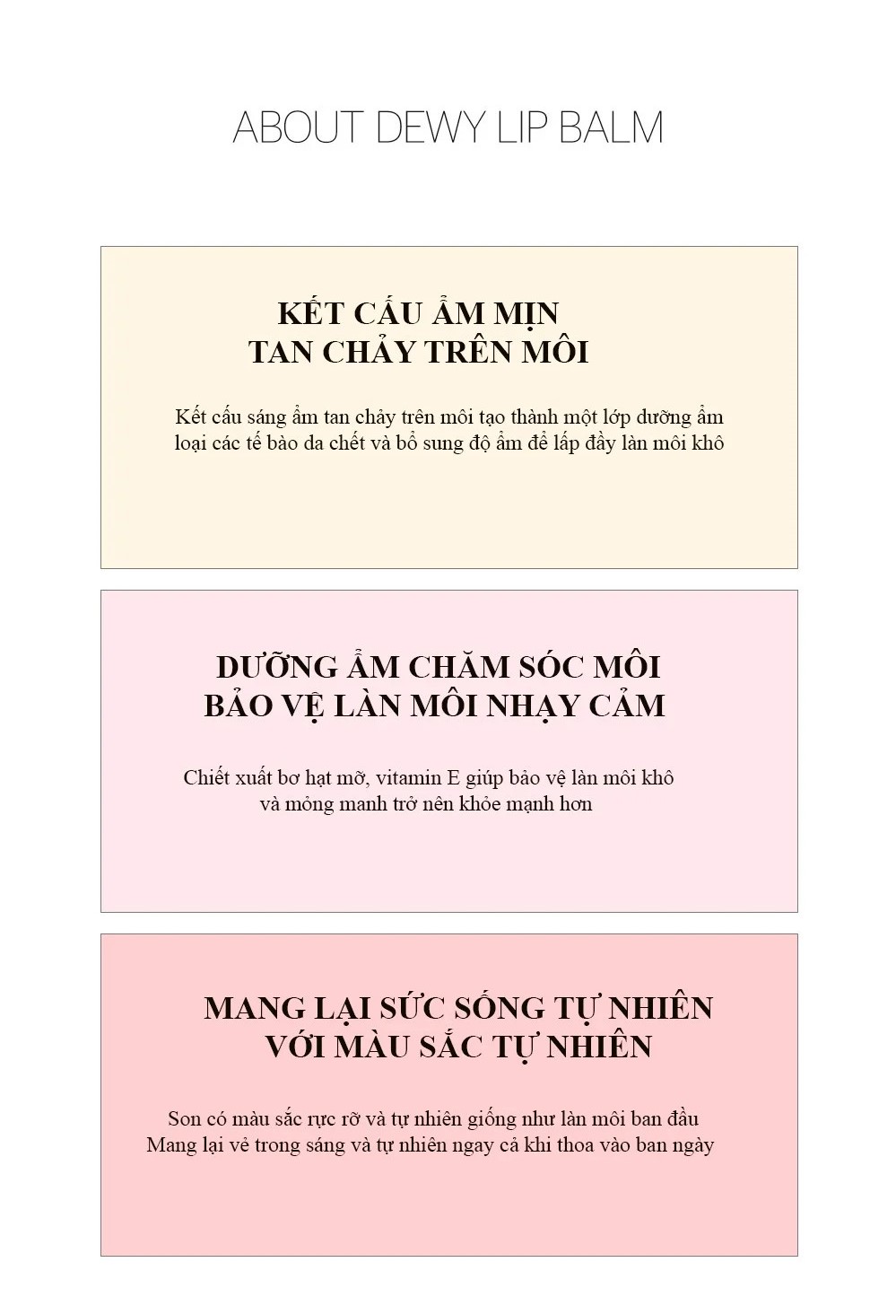 - Son dưỡng có màu BOM Dewy Lip Balm có kết cấu dạng thỏi màu trắng sữa. Kết cấu này giúp son dễ dàng bám và thẩm thấu lên môi nhanh hơn mà không gây bết dính hay nặng, bí môi. Chất son mang lại cảm giác nhẹ dịu, đặc biệt se nhanh khi sử dụng.