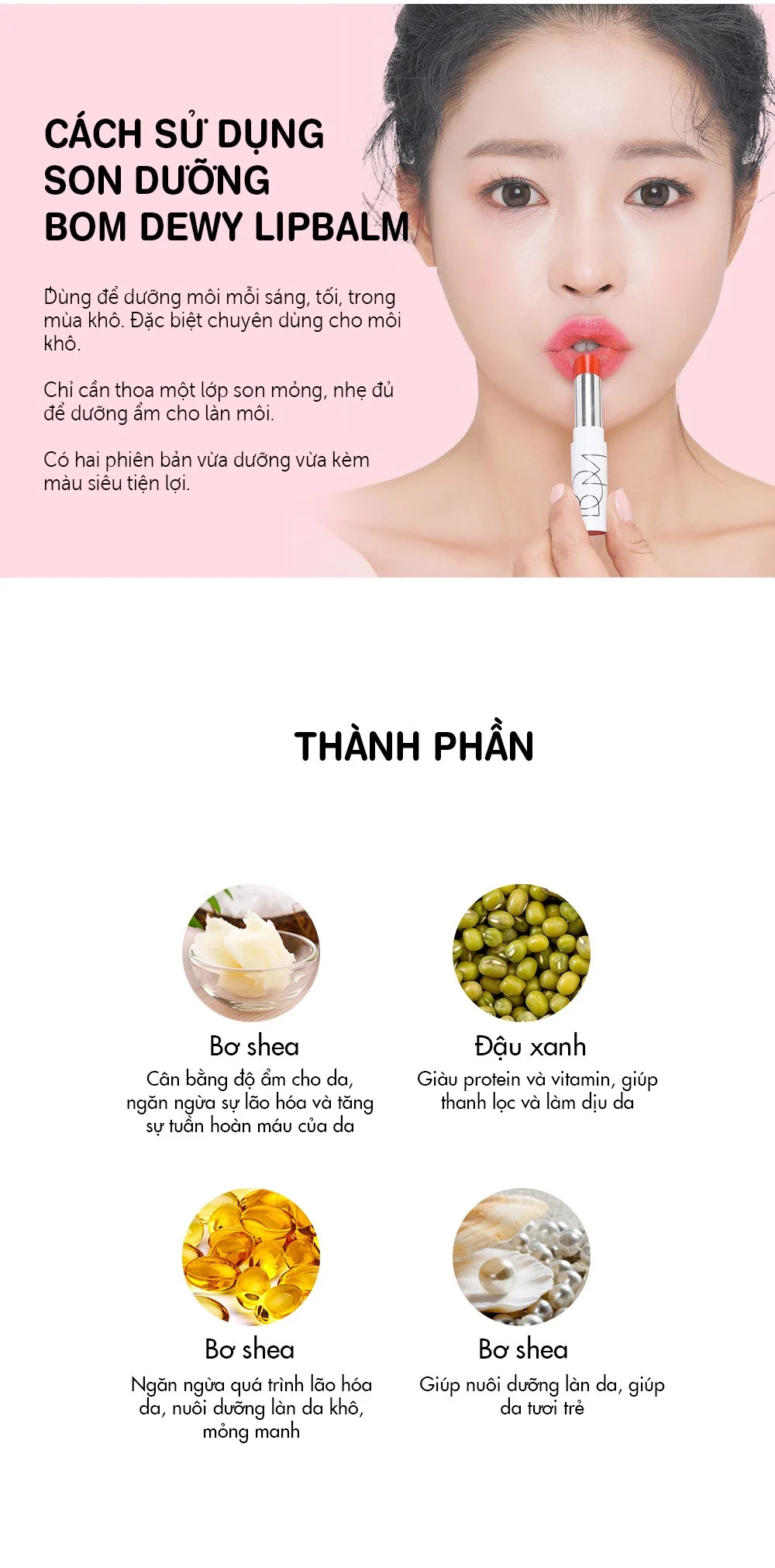- Cùng với đó, đậu xanh có trong son dưỡng có màu Bom Dewy Lip Balm giàu vitamin nhóm B, giúp thanh lọc và làm dịu da hiệu quả.