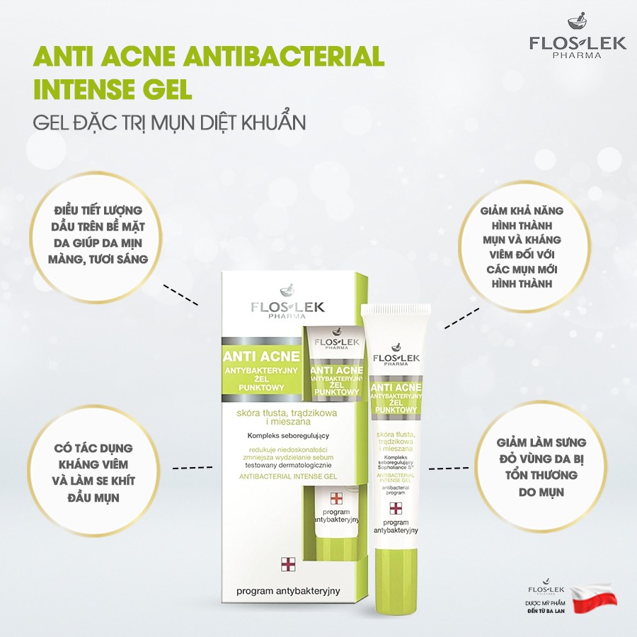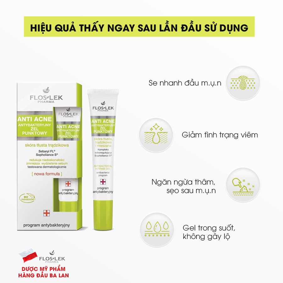 Gel Đặc Trị Mụn, Diệt Khuẩn Floslek Anti Acne Spot Gel For Imperfections 20ml là sản phẩm giúp ngăn ngừa mụn, kiểm soát dầu nhờn, ngăn ngừa tình trạng ách tắc lỗ chân lông. Sản phẩm giúp giảm sưng, kháng viêm, trị mụn diệt khuẩn, ngăn không cho dầu tiết da, giảm nguy cơ hình thành mụn, tiêu diệt các vi khuẩn gây mụn, làm thông thoáng lỗ chân lông, phục hồi làn da, làm lành các vết thương do mụn gây ra.
