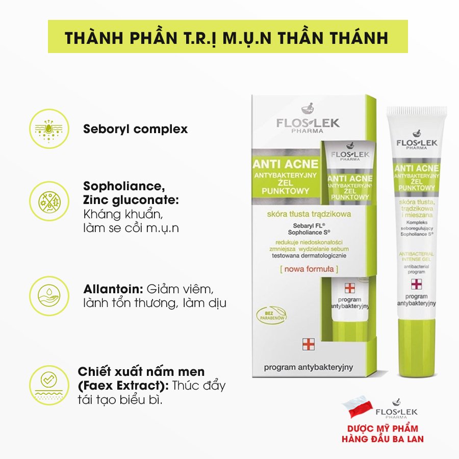 - Chứa chiết xuất nấm men Faex, hạt dẻ ngựa có tác dụng kháng viêm, làm se khít đầu mụn, đồng thời điều tiết lượng dầu trên da, làm giảm khả năng hình thành mụn, giảm sưng đỏ, giúp da khỏe mạnh và mịn màng sạch mụn. Sản phẩm phù hợp với da dầu, da hỗn hợp. Bên cạnh đó, Floslek Anti Acne Spot Gel For Imperfections còn được bổ sung dưỡng chất nuôi dưỡng làn da khỏe mạnh. Panthenol làm dịu, phục hồi tái tạo tế bào da mới giúp da săn chắc mịn màng, giảm sưng viêm, se khô đầu mụn và đẩy nhân mụn.