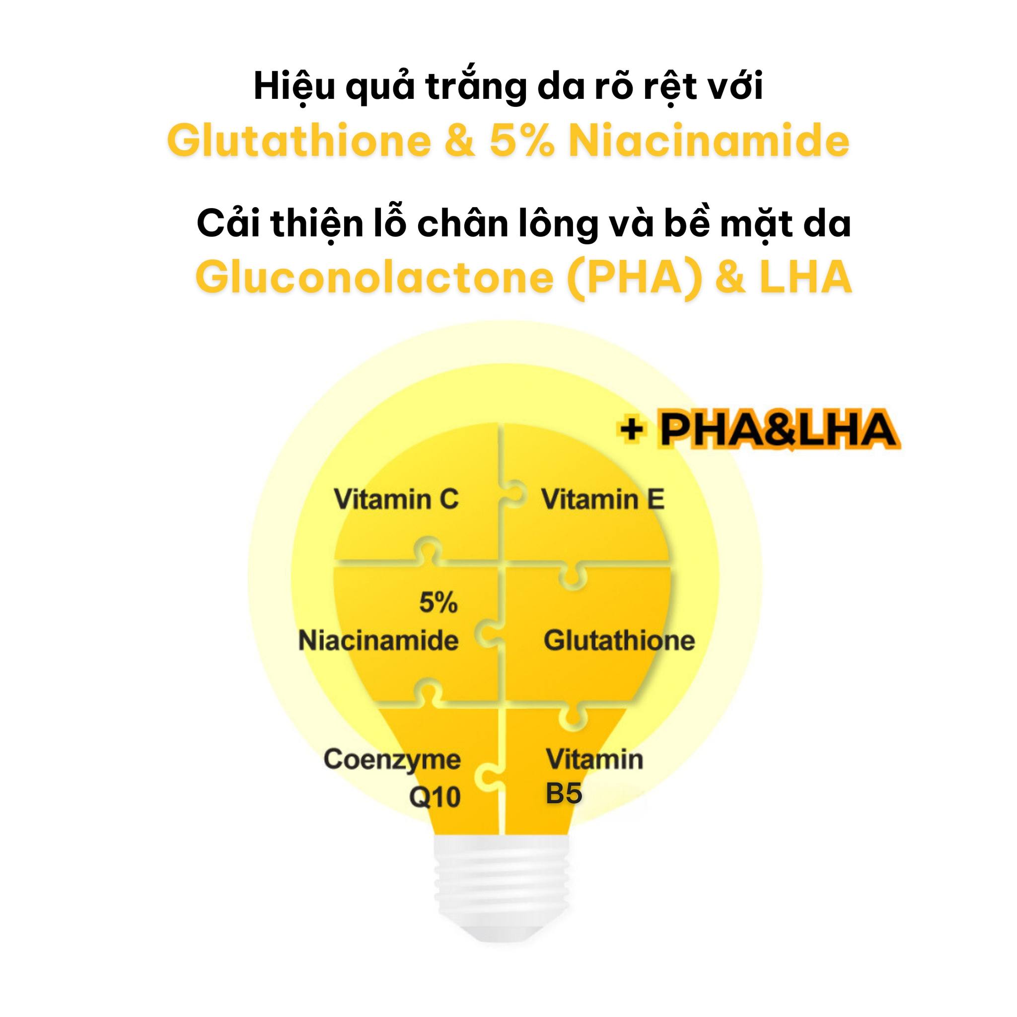 - 5% Niacinamide kết hợp cùng Vitamin C dạng LAA & Ascorbyl Glucoside: là combo “hủy diệt” đốm nâu, thâm đen lẫn thâm đỏ, chống oxi hóa, cải thiện độ sáng của da.