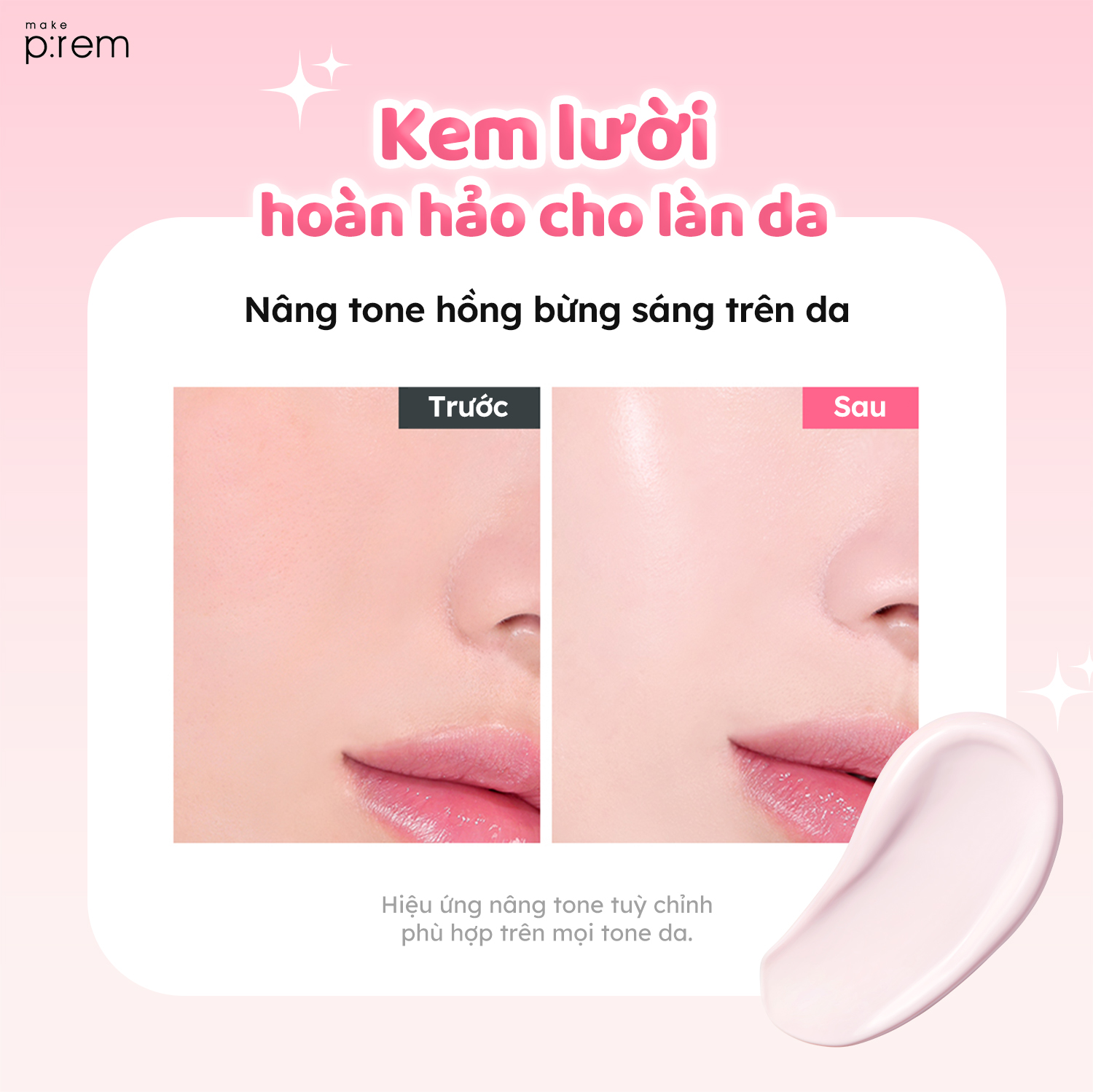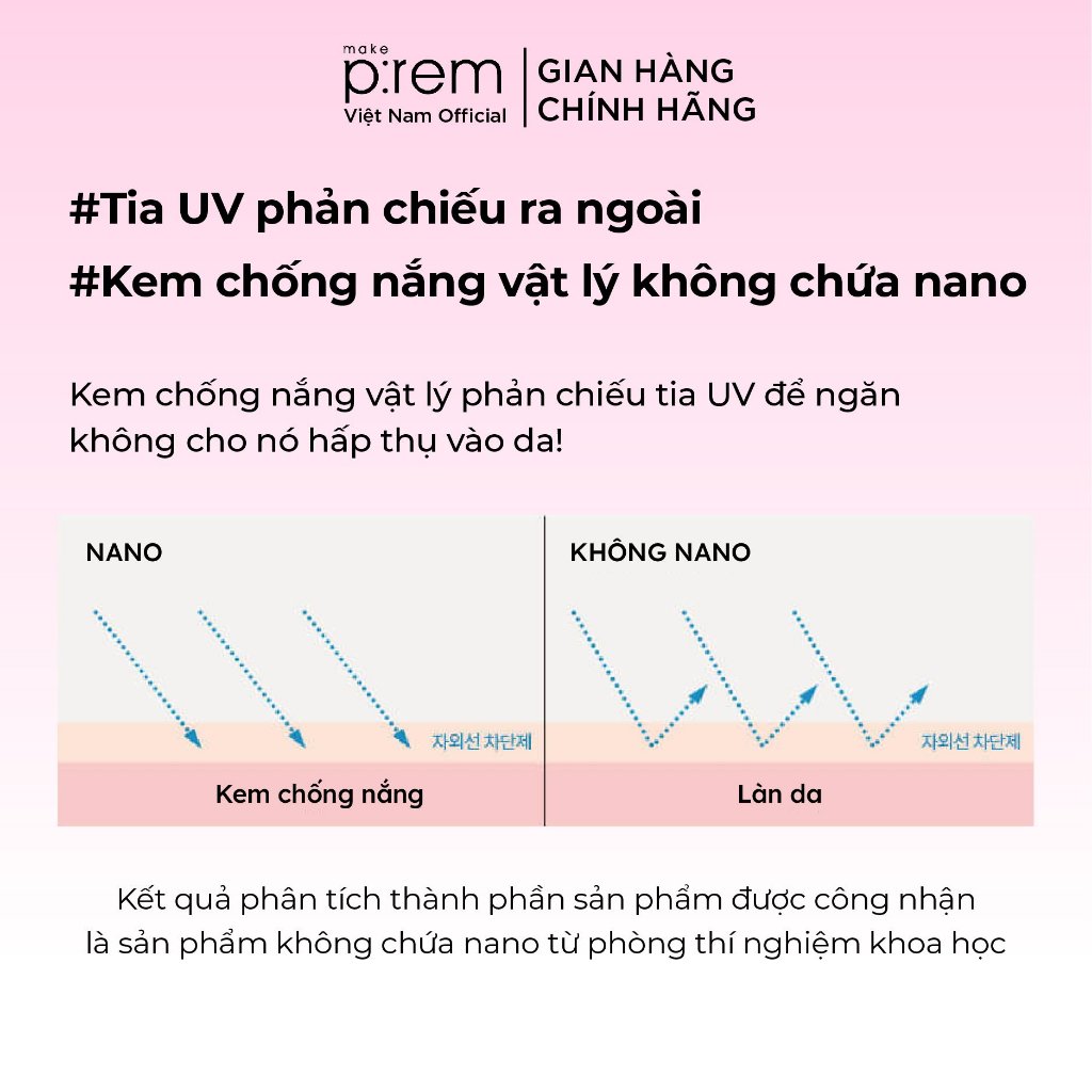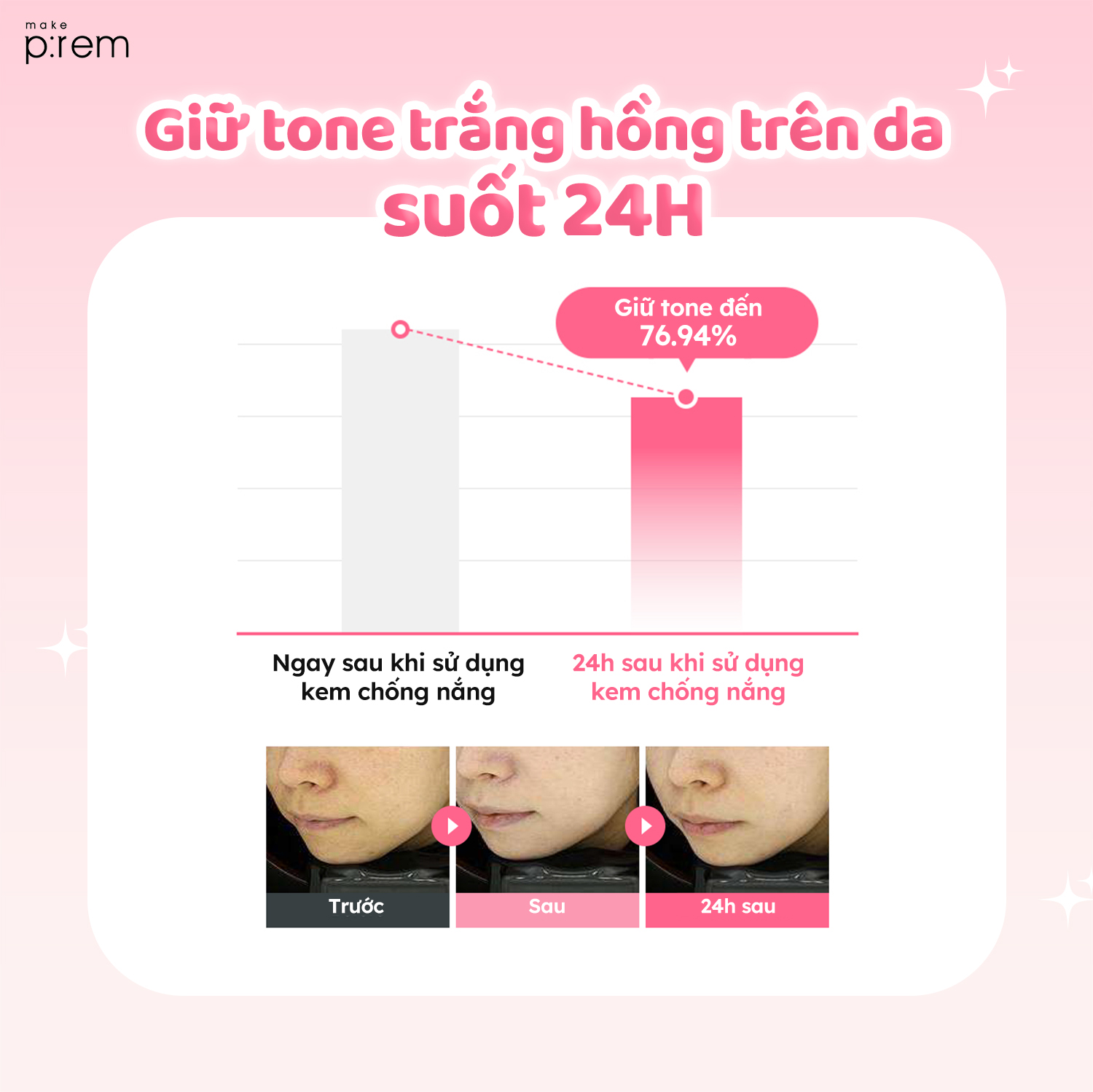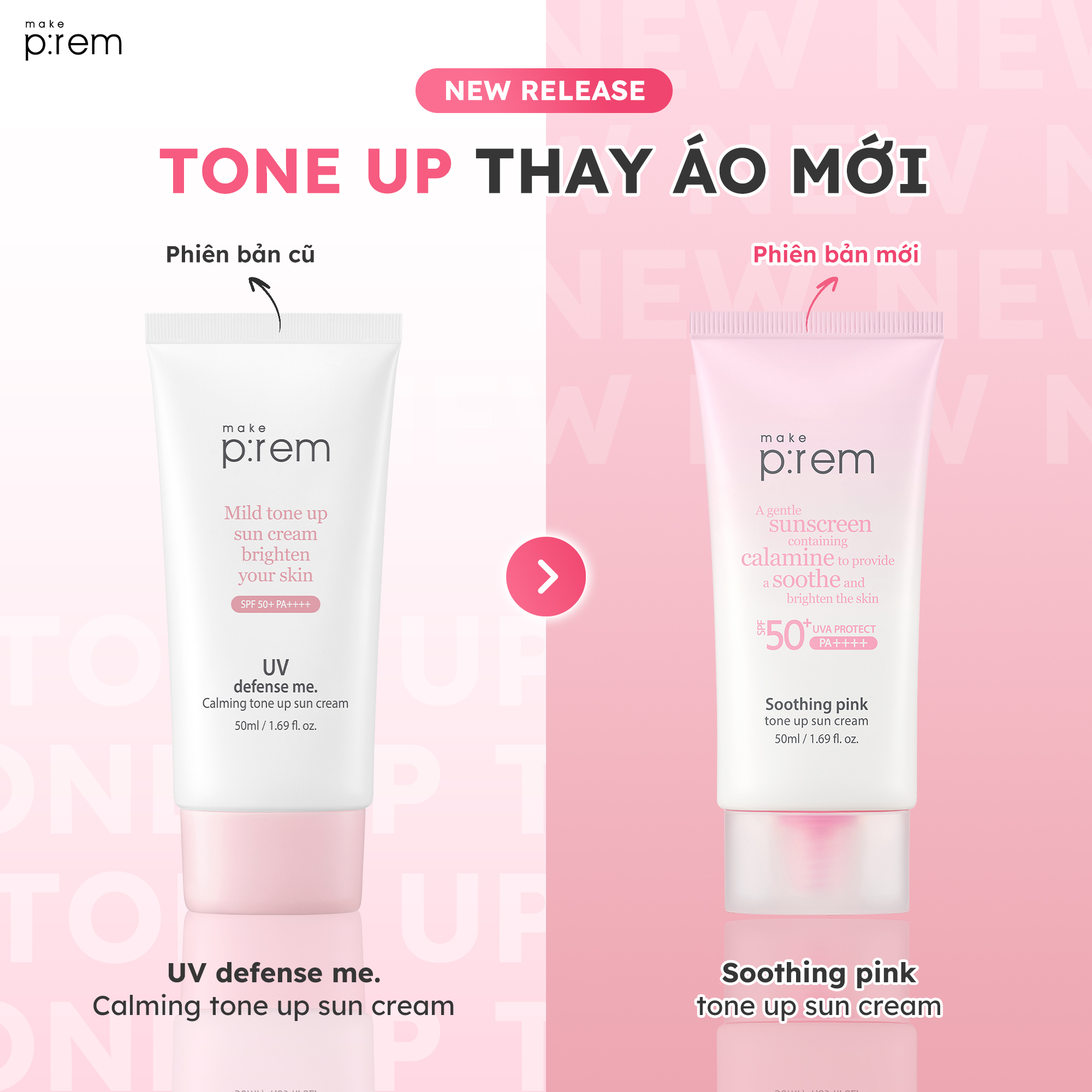 - Kem chống nắng nâng tone Make P:rem UV Defense Me Calming Tone Up Sun Cream là dòng kem chống nắng thuần vật lý có tác dụng bảo vệ da khỏi tia UV cũng như những tác dụng xấu từ bên ngoài hiệu quả, mà còn có “ghi điểm” bởi khả năng mang lại làn da trắng hồng rạng rỡ nhờ công nghệ Non-nano có hiệu ứng nâng tone sáng hồng nhờ thành phần Calamine 2.31%.