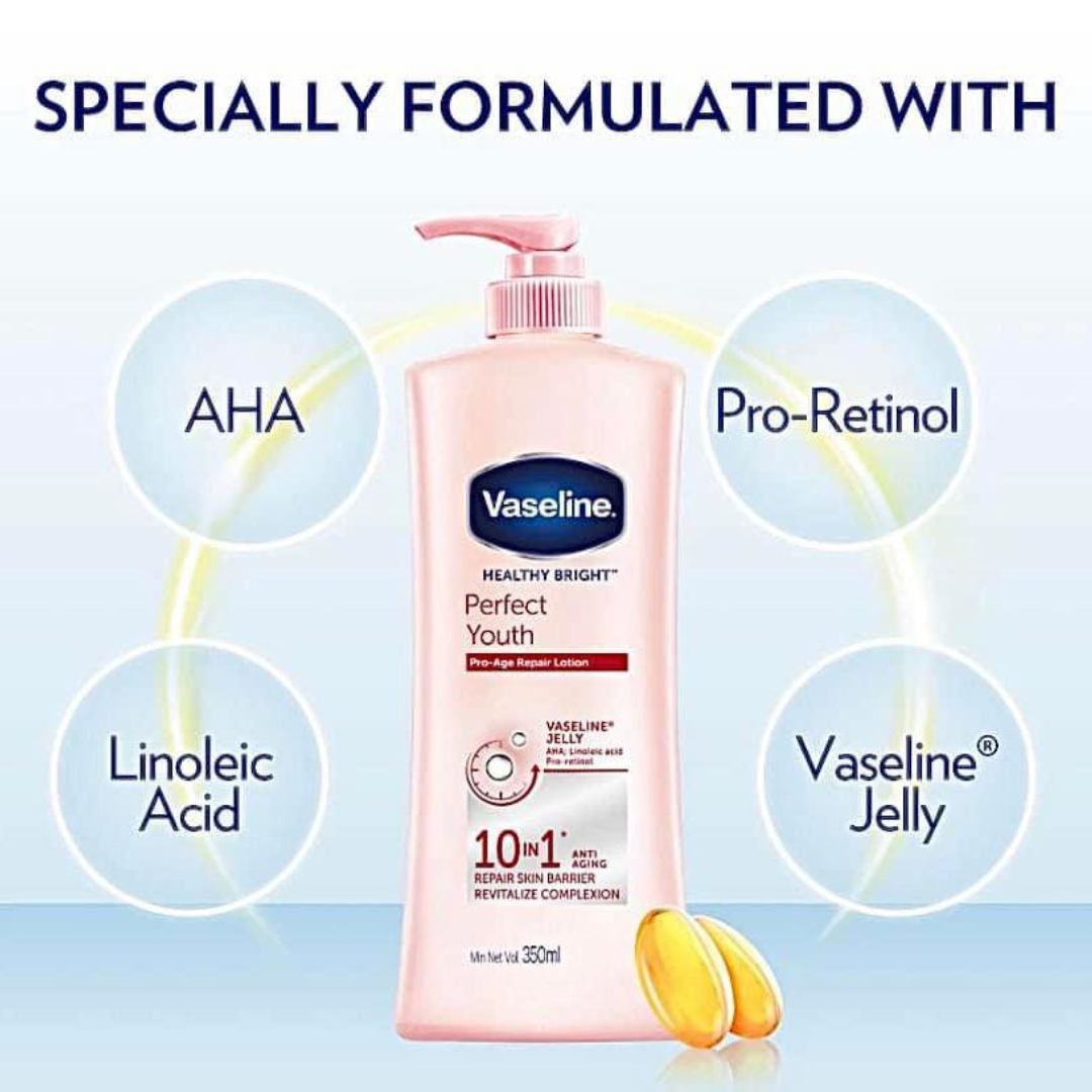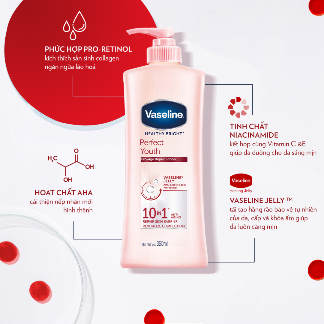 Sữa Dưỡng Thể Vaseline Healthy Bright Perfect Youth Pro-Age Repair Lotion MỚI với công thức chứa phức hợp Pro-retinol & hoạt chất AHA sẽ giúp kích thích sản sinh collagen và hỗ trợ cải thiện các nếp nhăn, mang đến cho bạn làn da trông tươi trẻ và căng mướt mịn màng, rạng ngời sức sống hơn bao giờ hết. Bên cạnh đó, sản phẩm còn dưỡng sáng da với Niacinamide & Vitamin E và cấp ẩm, khoá ẩm với giọt Vaseline Jelly siêu nhỏ.