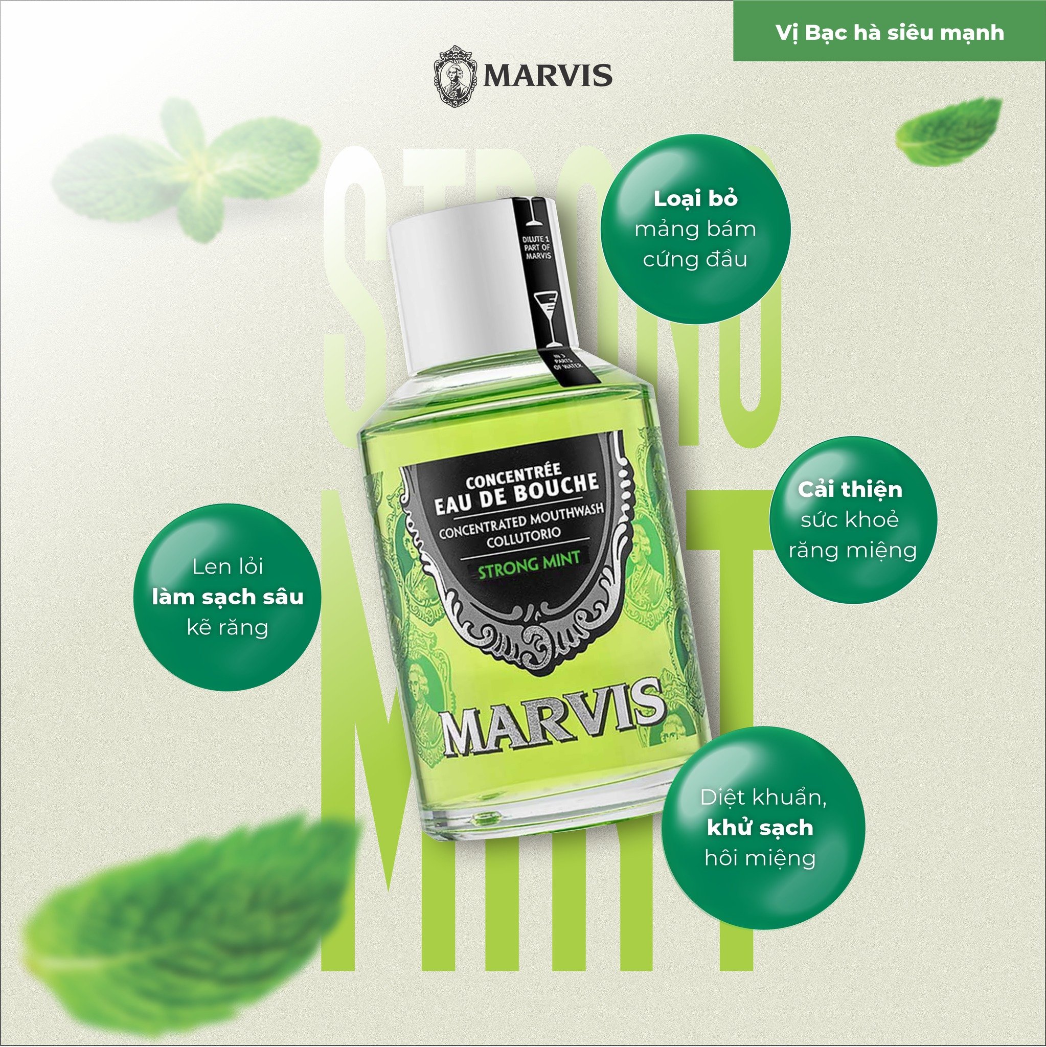 Nước Súc Miệng Marvis Strong Mint MouthWash là một sản phẩm chăm sóc răng miệng của Marvis bên cạnh dòng kem đánh răng cao cấp. Sản phẩm với công thức đậm đặc giúp loại bỏ vi khuẩn mà không làm kích ứng răng và nướu. Ngoài ra, thành phần của sản phẩm còn có chiết xuất keo ong và xilytol giúp chống lại nguy cơ sâu răng và viêm nướu.
