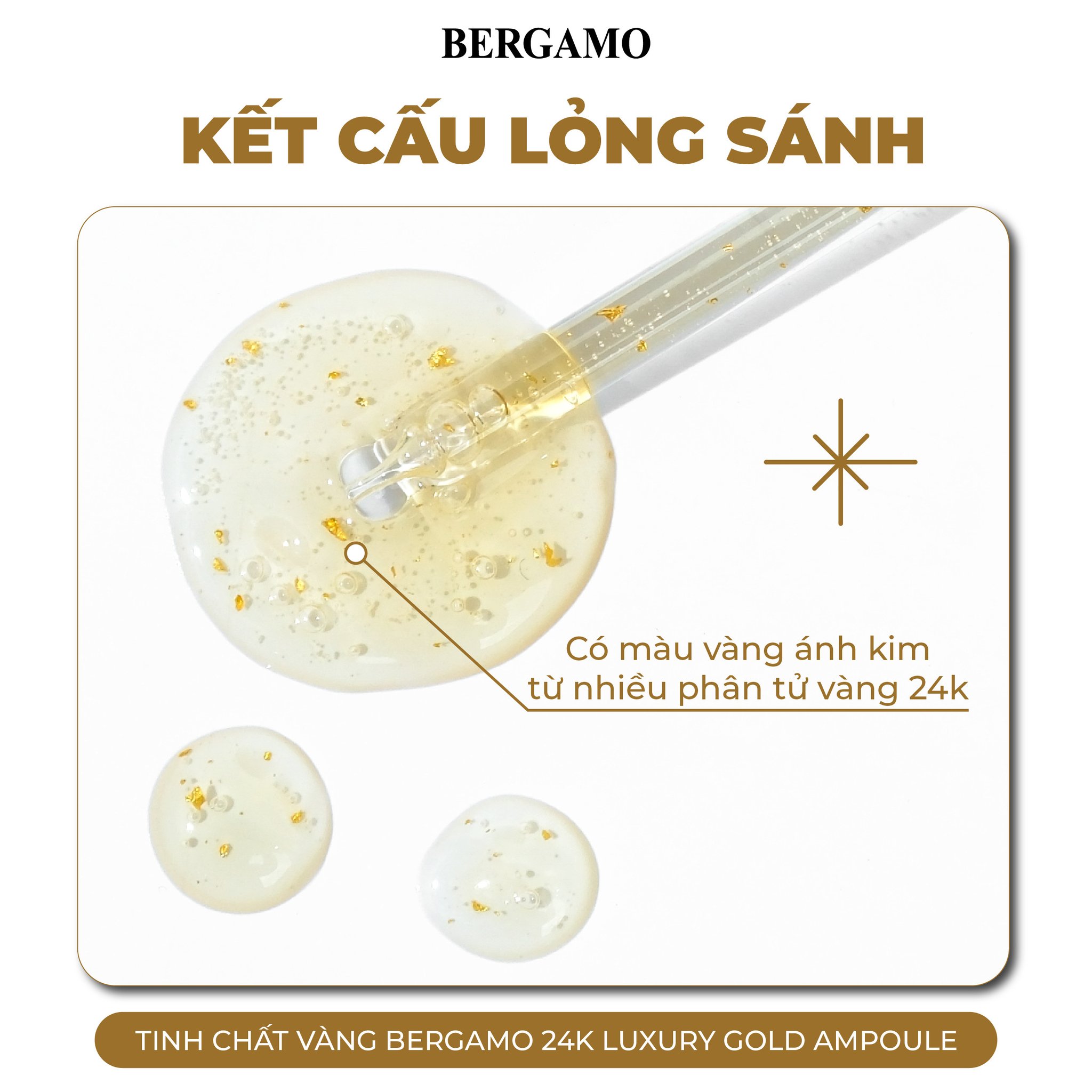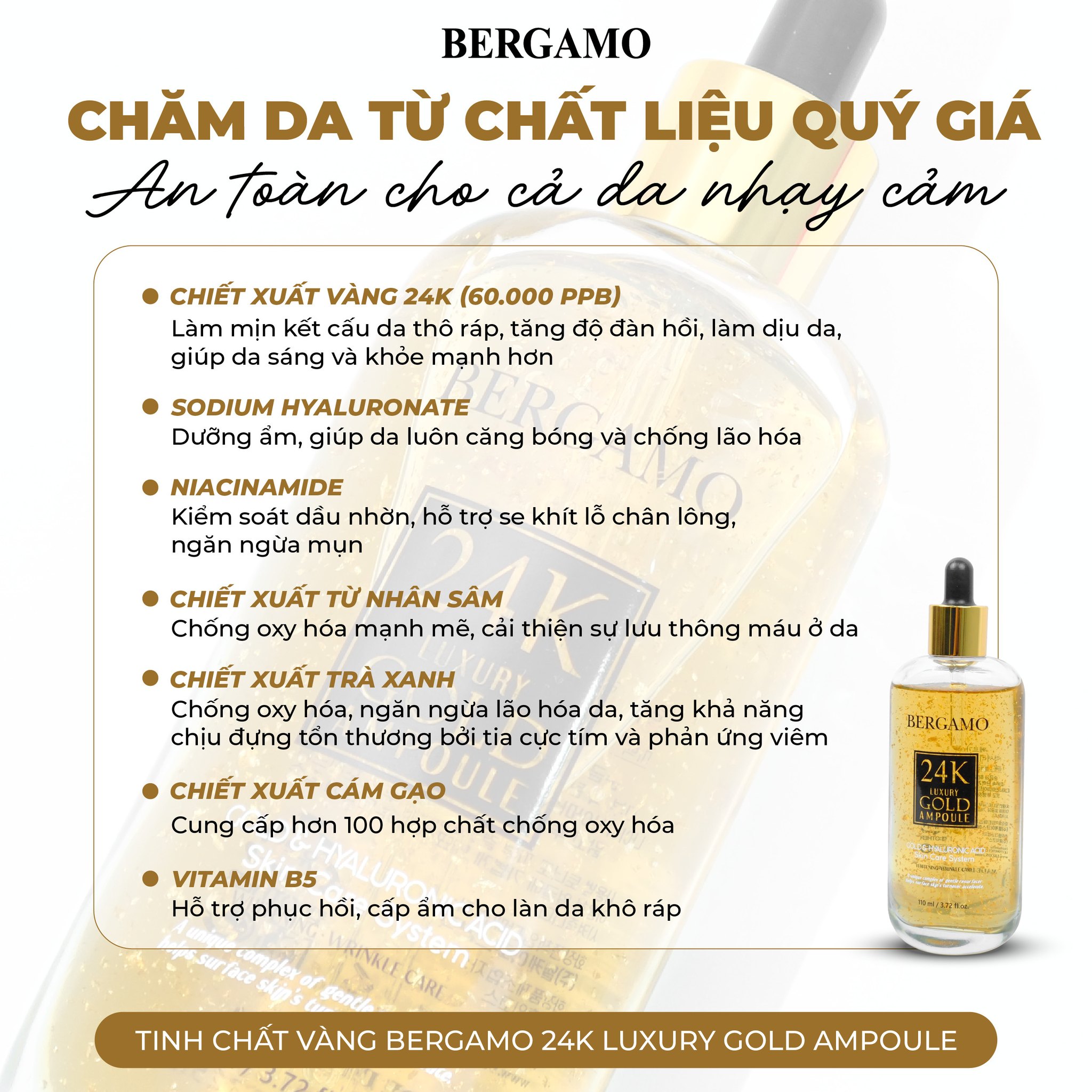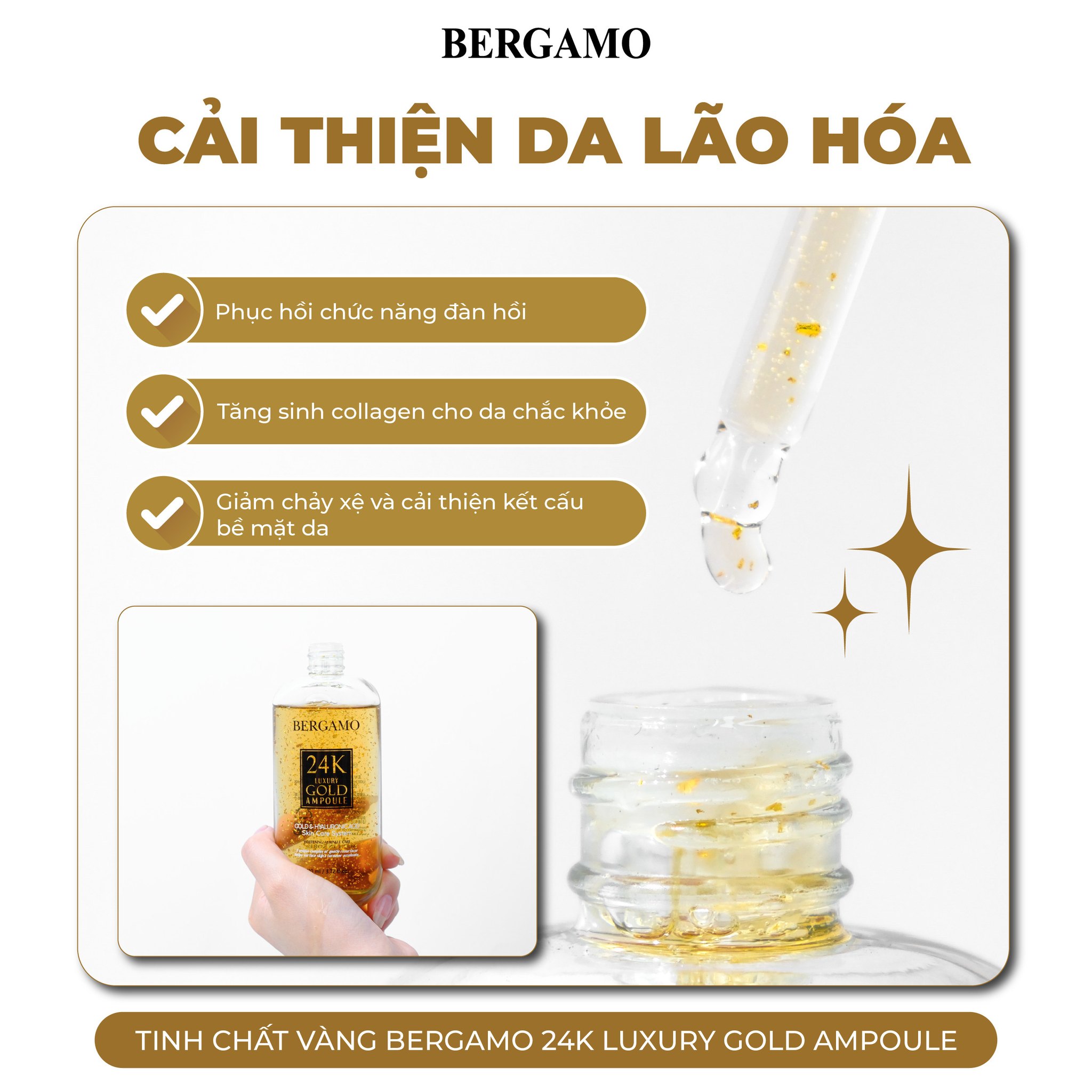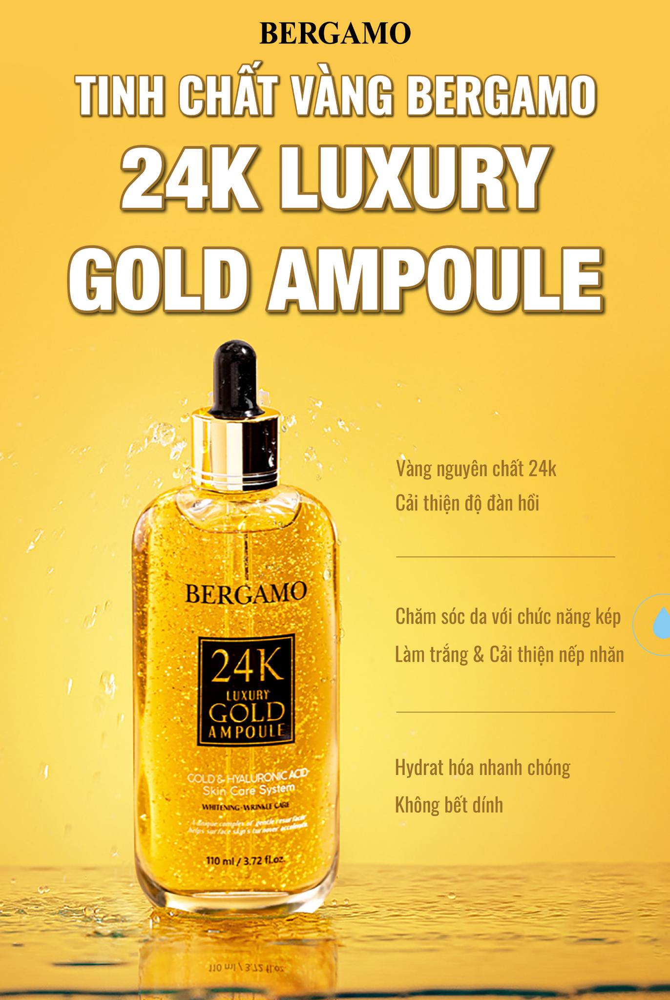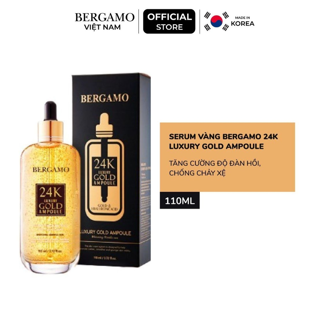Serum vàng Bergamo 24K Luxury Gold Ampoule 110ml là dòng serum đến từ thương hiệu Bergamo - đây là một thương hiệu lâu đời tại Hàn Quốc. Hầu hết các sản phẩm từ Bergamo đều được chiết xuất từ các thành phần an toàn lành tính và hiệu quả cho làn da.