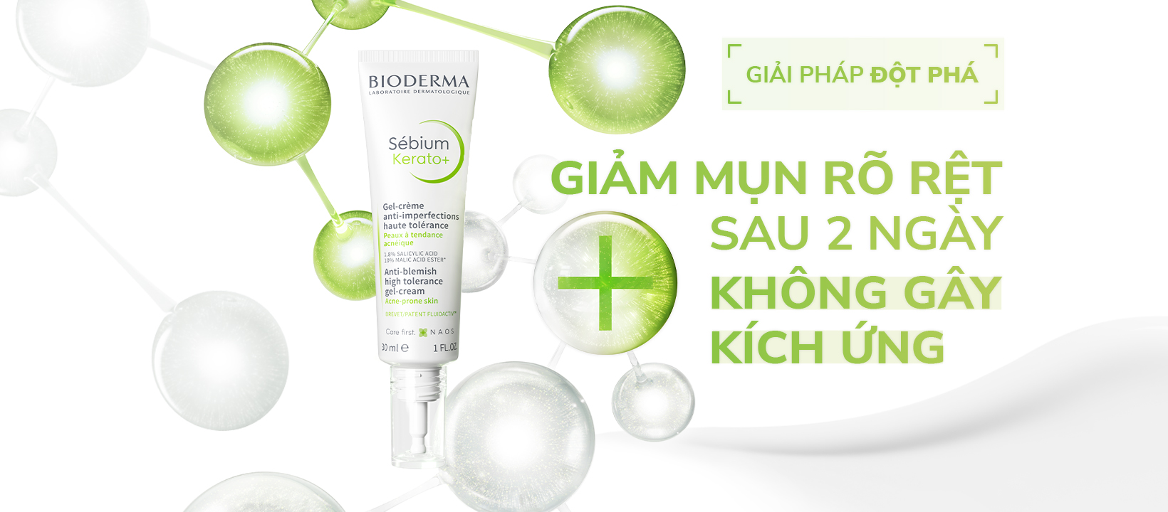 - Kem Dưỡng Giảm Mụn, Ngăn Ngừa Mụn Tái Phát Bioderma Sebium Global với công thức đặc biệt chứa bộ đôi hoạt chất tiêu sừng (Salicylic Acid và Malic Acid Ester), tác động cả trên và dưới bề mặt da, loại bỏ mụn và vết thâm hiệu quả, giúp dưỡng ẩm da mang lại làn da thông thoáng, đều màu hơn.