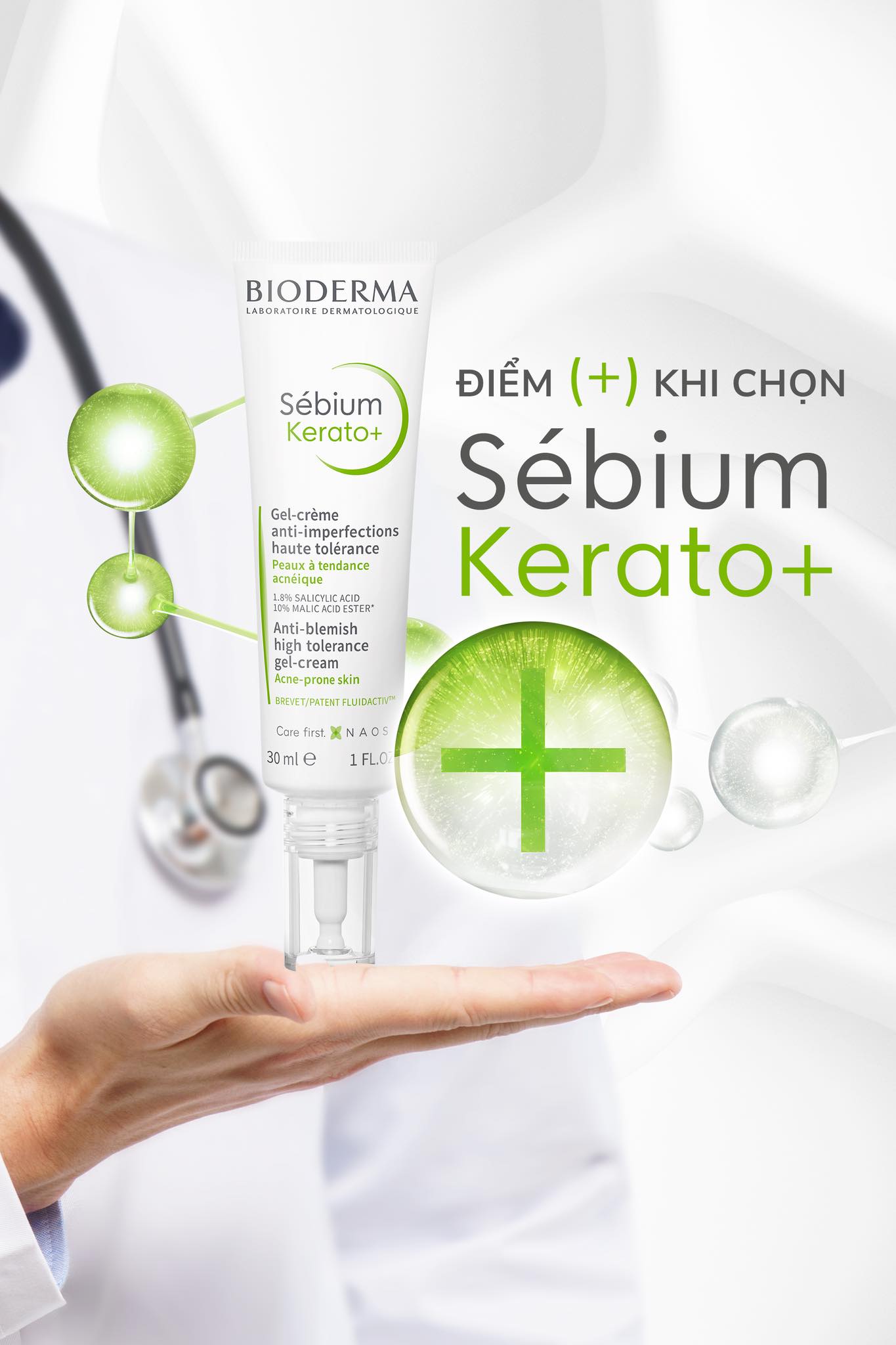 Kem Dưỡng Hỗ Trợ Giảm Mụn & Mờ Thâm Bioderma Sebium Kerato+ 30ml là kem dưỡng thuộc thương hiệu dược mỹ phẩm Bioderma đến từ Pháp. Với sự kết hợp bộ đôi hoạt chất 1,8% Salicylic Acid & 10% Malic Acid Ester giúp tiêu sừng, điều tiết lượng bã nhờn dư thừa, ngăn chặn bít tắc lỗ chân lông và gây ra mụn, hỗ trợ giảm mụn từ nhẹ đến trung bình, giảm các vết thâm do mụn. Đồng thời với tác động kép của bộ đôi hoạt chất giúp tác động cả trên và dưới bề mặt da, giúp da thông thoáng, giảm mụn, vết thâm, phù hợp với da dầu đến hỗn hợp có mụn.