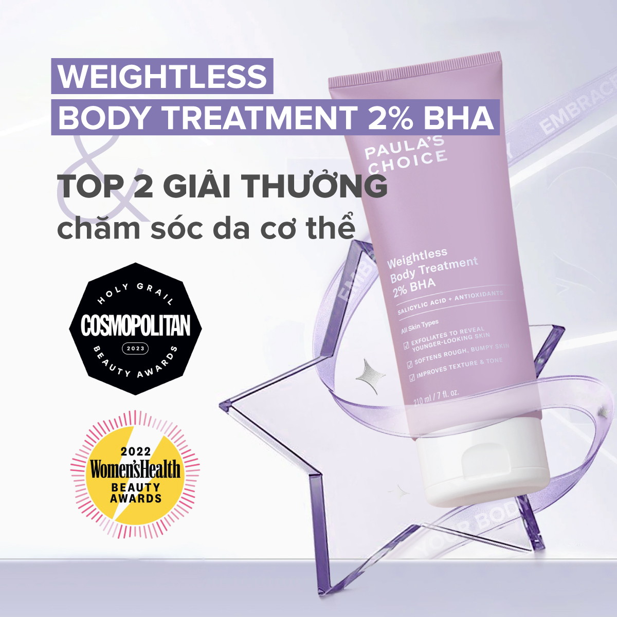 Kem Dưỡng Thể Tẩy Tế Bào Chết Đặc Trị Viêm Lỗ Chân Lông, Mẫn Đỏ Paula's Choice Weightless Body Treatment 2% BHA với công thức chứa BHA giúp cải thiện các vấn đề về lỗ chân lông, làm mịn và phục hồi làn da khỏe mạnh, sản phẩm có khả năng loại bỏ tế bào chết nhưng không gây bào mòn da mà duy trì độ ẩm mịn tự nhiên cho da.