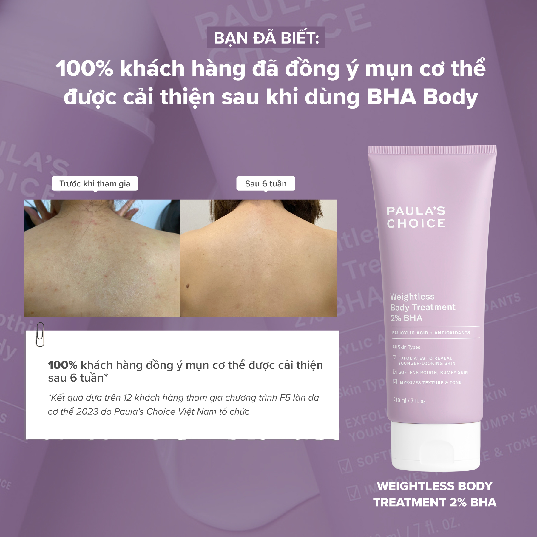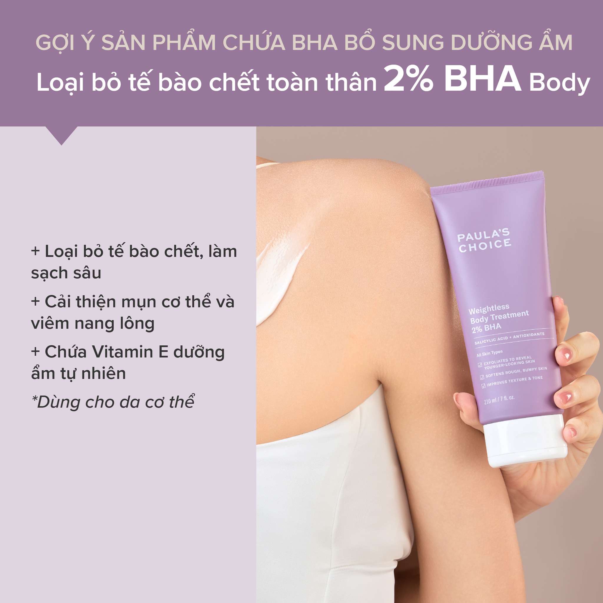 - Kem Dưỡng Thể Tẩy Tế Bào Chết Đặc Trị Viêm Lỗ Chân Lông, Mẫn Đỏ Paula's Choice Weightless Body Treatment 2% BHA với công thức chứa hàm lượng 2% BHA có khả năng len lỏi vào sâu từng lỗ chân lông phá vỡ lớp cấu trúc bề mặt trên da cùng lớp sừng một cách nhẹ nhàng, từ đó làm sạch tế bào chết, giảm thiểu tình trạng lỗ chân lông bị tắc nghẽn gây viêm nang lỗ chân lông hay lông mọc ngược. Từ đó làm tiền đề cho các tế bào mới được sinh ra, phục hồi làn da mềm mịn tự nhiên.