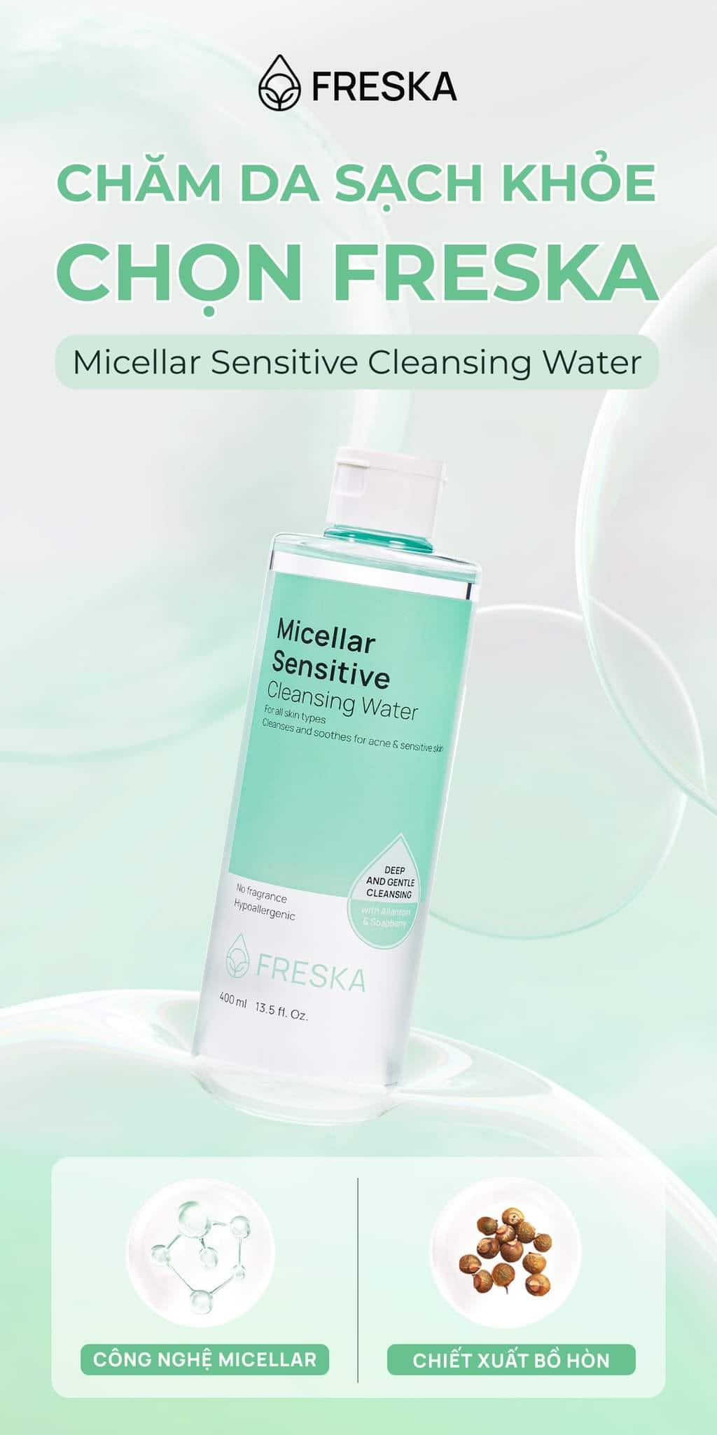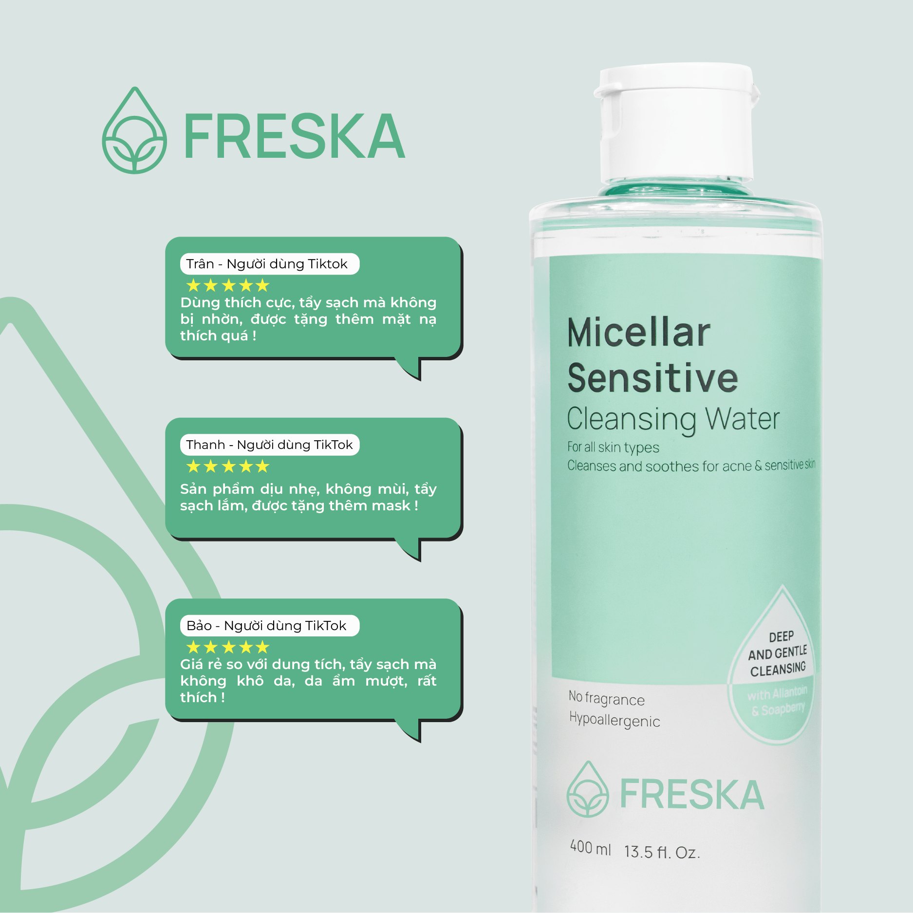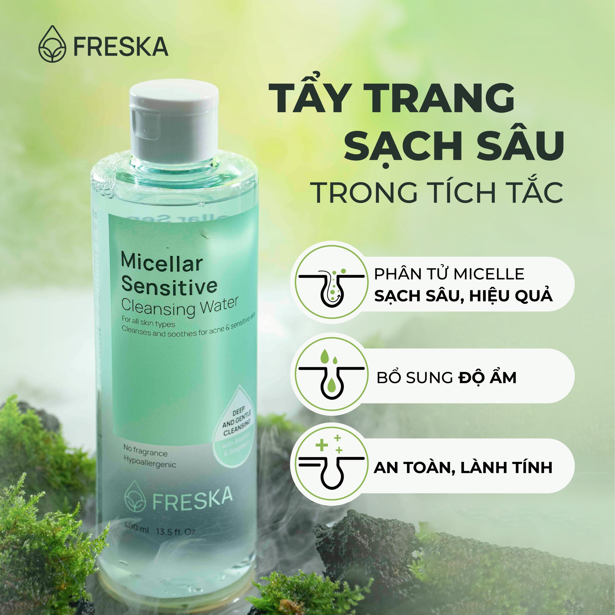 - Nước Tẩy Trang Làm Sạch Sâu, Dưỡng Ẩm Freska Micellar Sensitive Cleansing Water 400ml giúp tẩy trang do loại bỏ các tạp chất, bụi bẩn và lớp trang điểm trên da giúp da sạch sẽ. Kết hợp với ưu điểm sạch sâu nhờ công thức micellar của sản phẩm giúp làm sạch sâu lỗ chân lông, làm sạch một cách nhẹ nhàng và hiệu quả. Ngoài ra, sản phẩm hỗ trợ dưỡng ẩm từ các thành phần dưỡng ẩm nhẹ nhàng giúp giữ cho da mềm mại và không bị khô sau khi sử dụng.