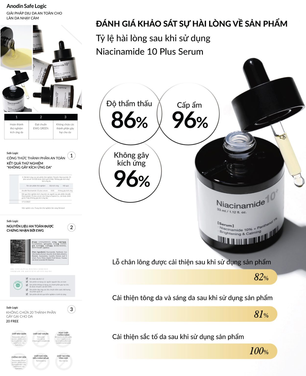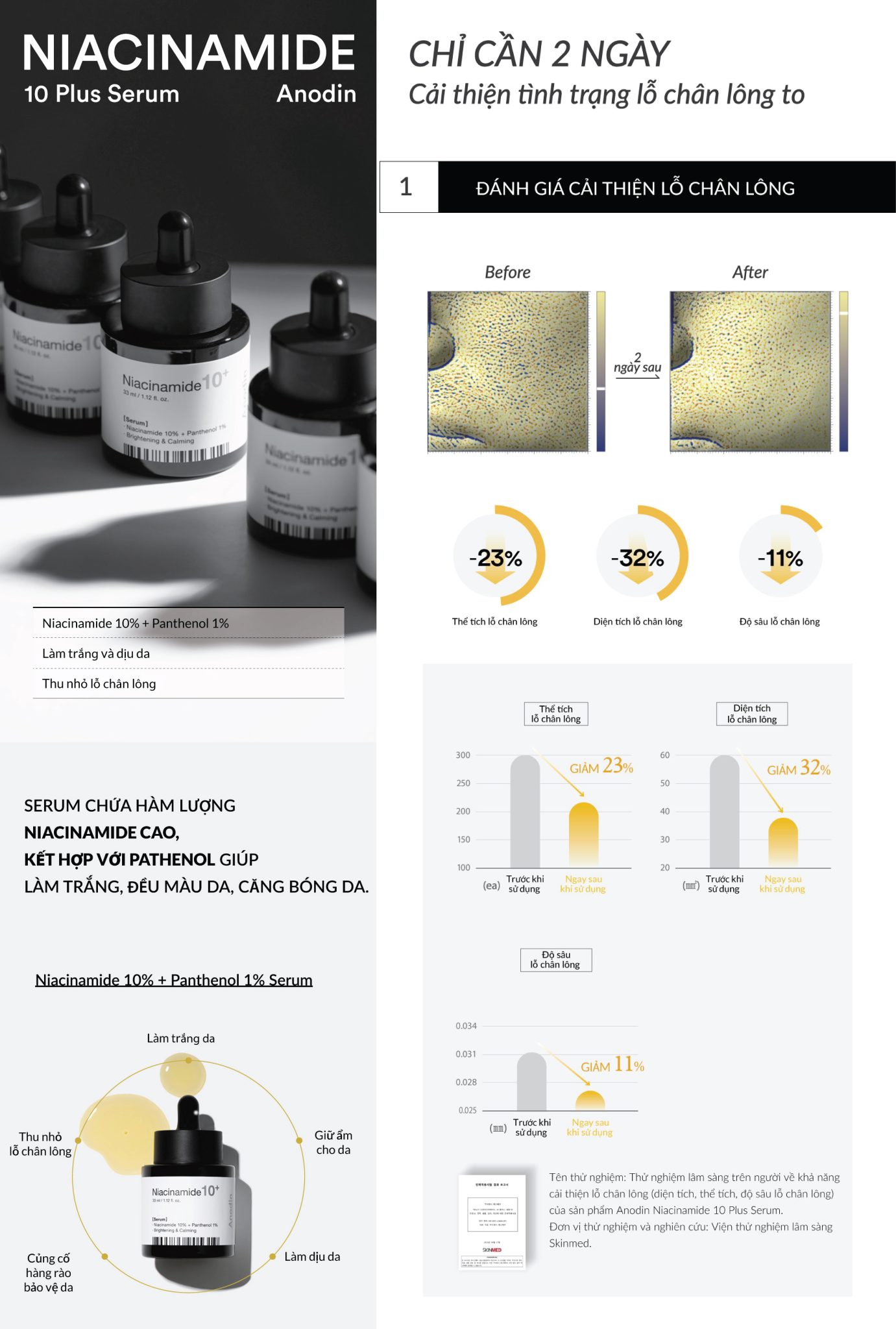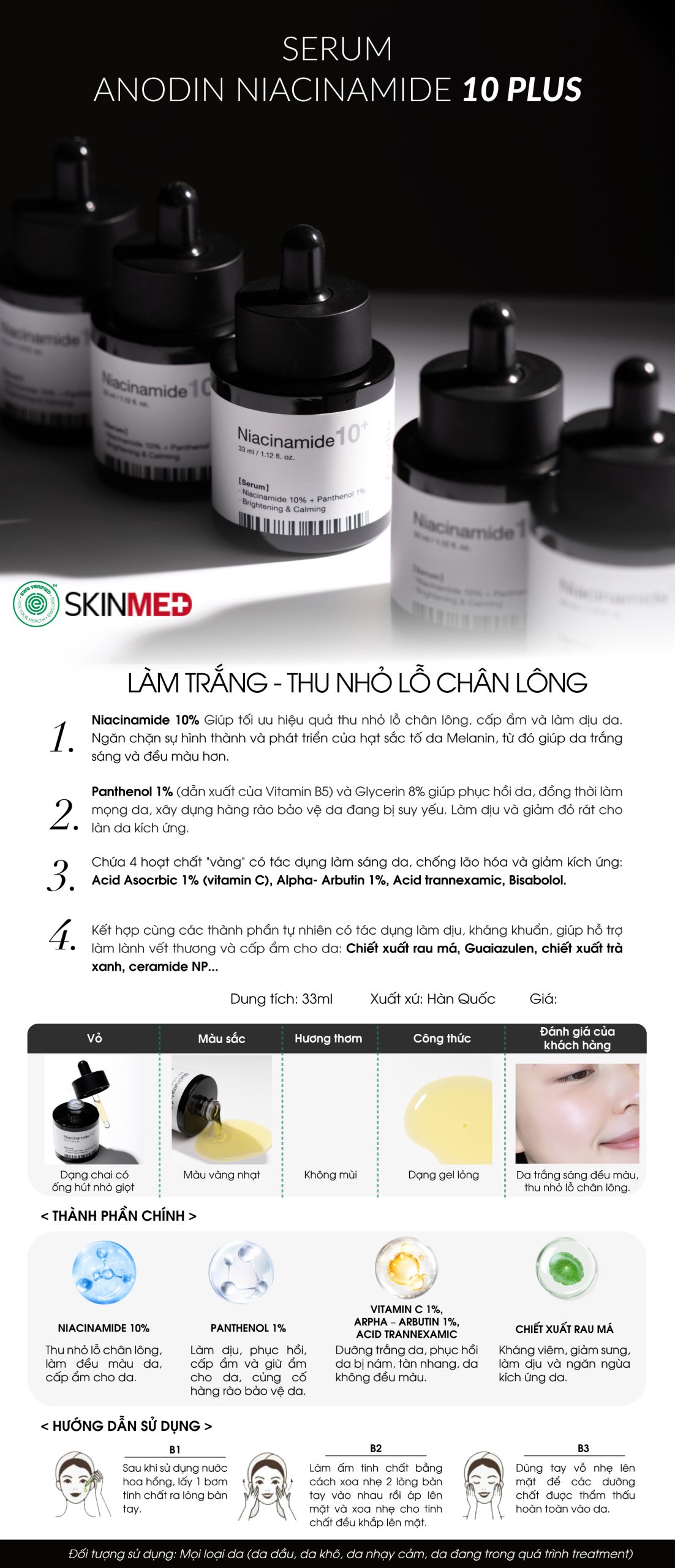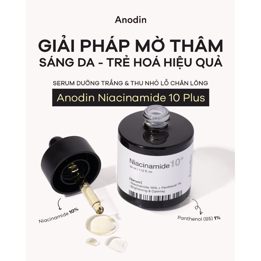 Tinh Chất Làm Trắng, Thu Nhỏ Lỗ Chân Lông Anodin Niacinamide 10 Plus là dòng dược mỹ phẩm thuần chay dành cho mọi loại da, đặc biệt là da nhạy cảm, da treatment được bác sĩ khuyên dùng. Sản phẩm chứa làm lượng Niacnamide cao kết hợp Pathenol giúp làm trắng, đều màu và căng bóng da.