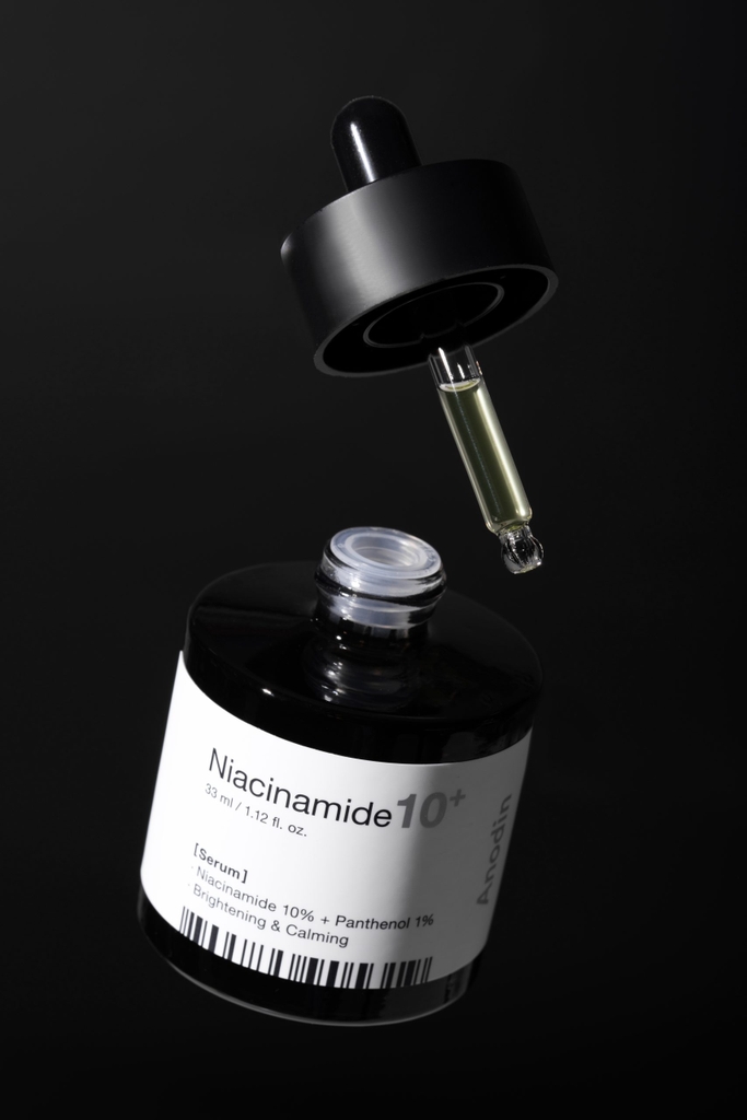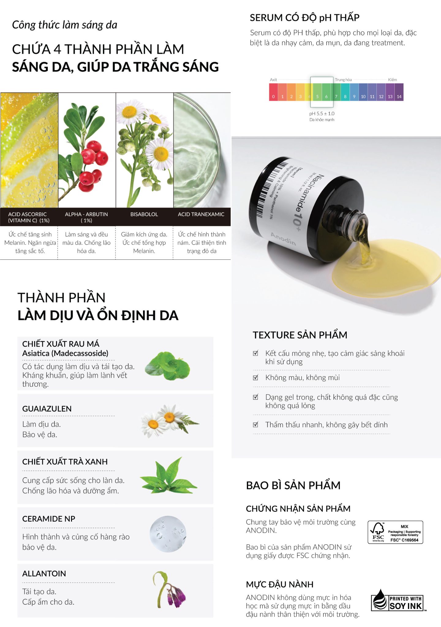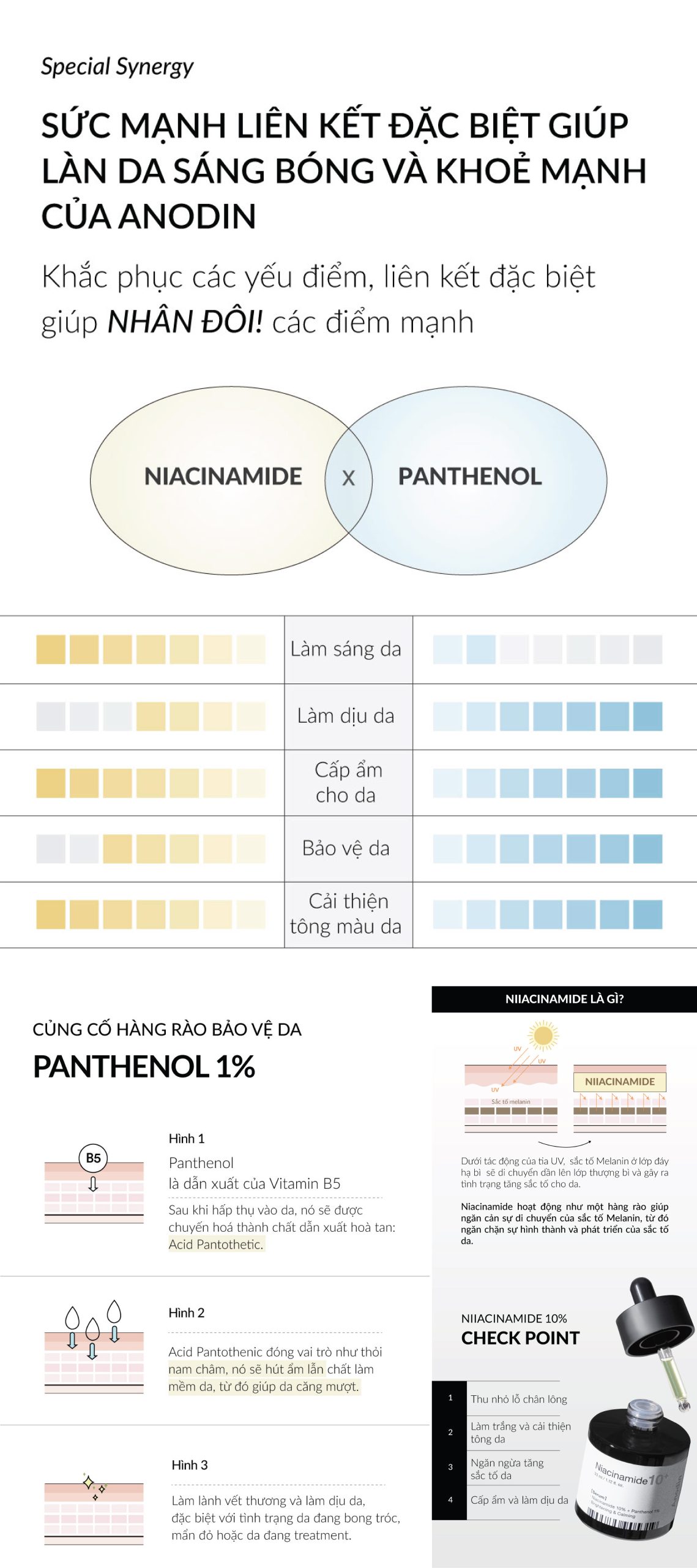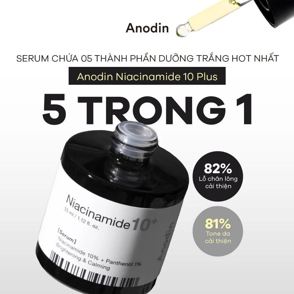 - Niacinamide 10% – Vitamin B3 với nồng độ 10% là thành phần chủ chốt trong Serum Anodin. Niacinamide đã chứng minh khả năng làm trắng da và kiểm soát dầu hiệu quả. Chất này còn giúp giảm sự xuất hiện của vết nám, tàn nhang và làm giảm lỗ chân lông, giúp da trở nên mịn màng và đều màu hơn.