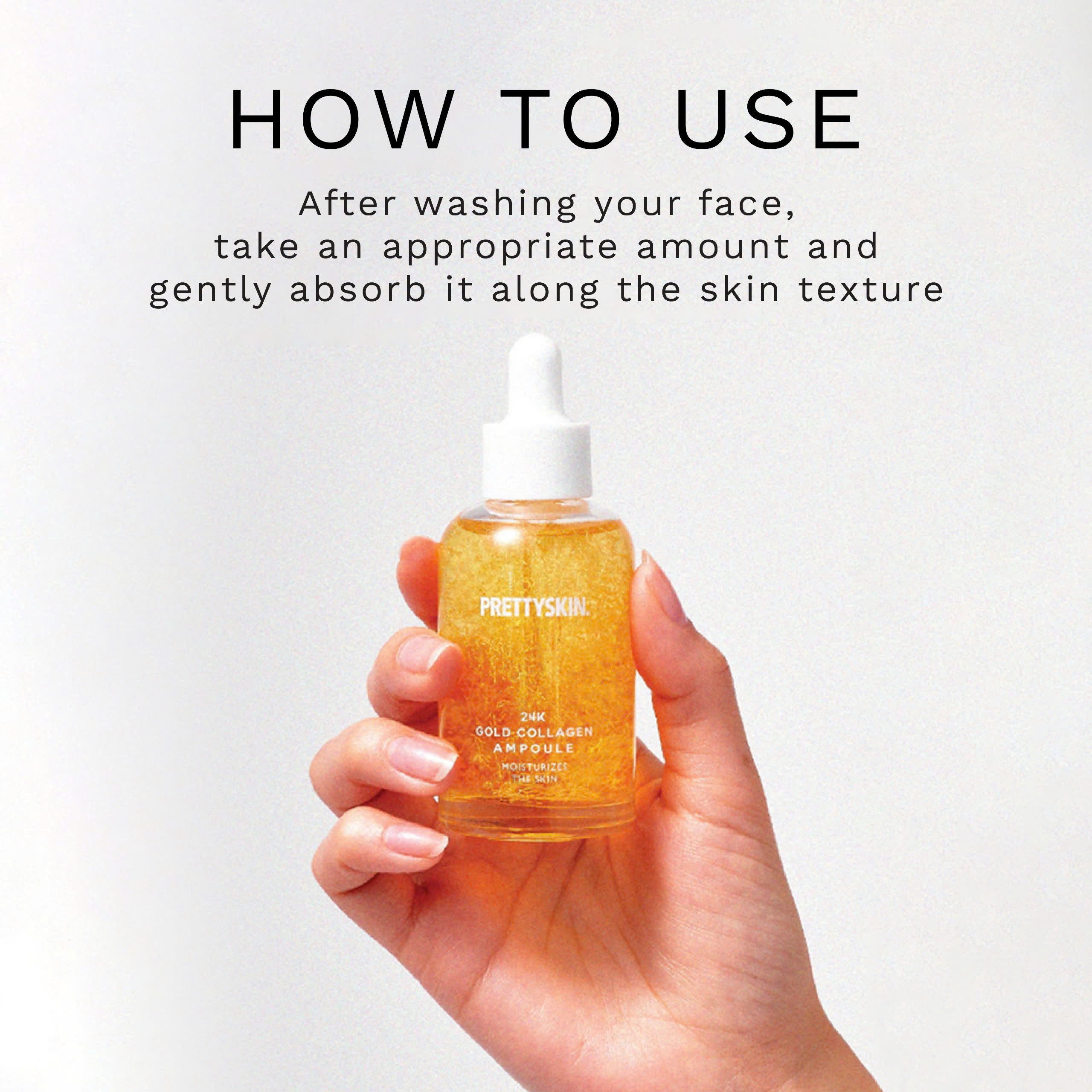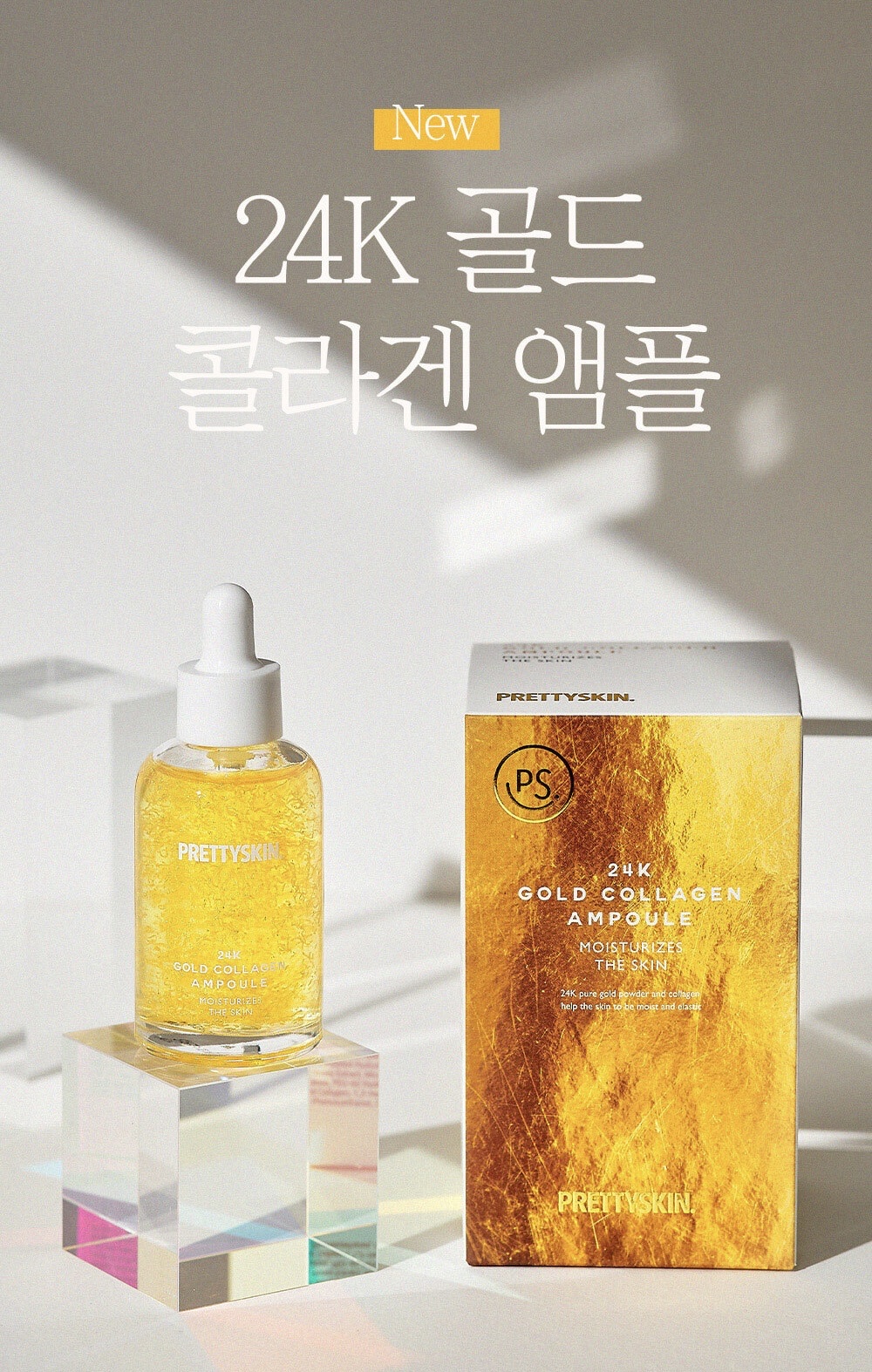 - Tinh Chất Dưỡng Da Pretty Skin 24K Gold Collagen Ampoule chứa đến 99,9% tinh chất vàng 24K cùng với collagen, peptides và beta-glucan giúp phục hồi da và trả lại làn da mịn màng, rạng rỡ. Thành phần hydrolysed Collagen (Collagen thủy phân) có công dụng kích thích quá trình tái sinh tế bào và gia tăng độ đàn hồi cho da. Đặc biệt công nghệ thủy phân giúp chia nhỏ các phân tử collagen từ đó da dễ dàng hấp thụ hơn, dưỡng chất được hấp thụ tối đa, tránh lãng phí.