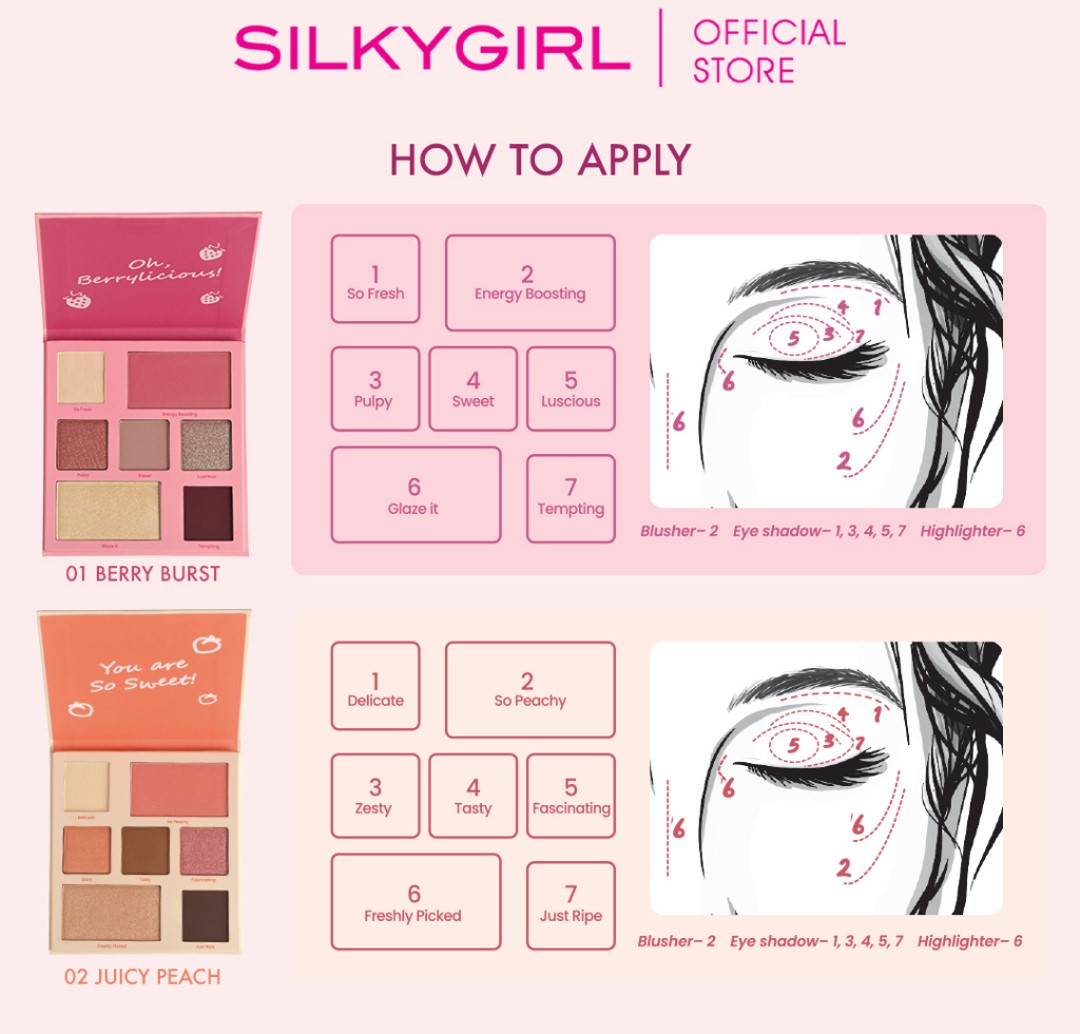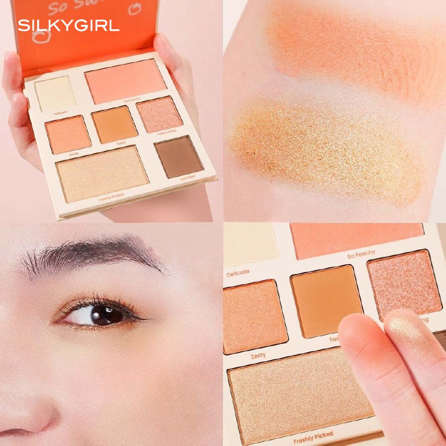 - Bảng Phấn Mắt & Mặt Silkygirl Eye & Face Palett lấy cảm hứng từ các trái cây mọng nước mang đến cho bạn sự tươi trẻ đầy năng lượng. Bảng màu bao gồm 1 ô bắt sáng, 5 màu phấn mắt, một màu má xinh xắn cho lớp Make Up thêm rạng ngời, hoàn hảo.