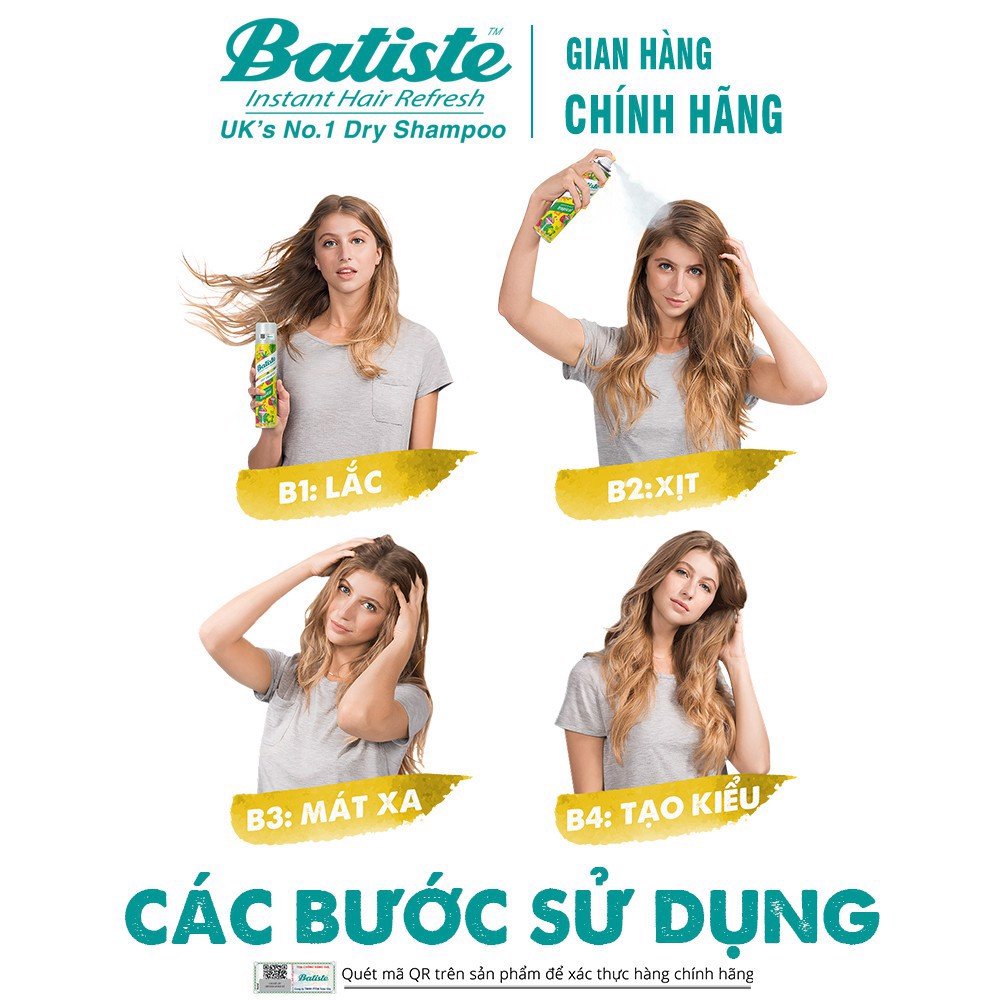 Dầu Gội Khô Giúp Làm Sạch, Tóc Bồng Bềnh Batiste Dry Shampoo là dòng dầu gội khô đến từ thương hiệu Batiste Anh Quốc. Là giải pháp hiệu quả cho những anh chàng và cô nàng thuộc tuýp da đầu bết dầu, tiết nhiều mồ hôi và bã nhờn, Batiste Dry Shampoo sẽ là cứu tinh giúp da đầu hết ngứa, bết dính và mang đến mái tóc bồng bềnh, mềm mại tức thì, cùng hương thơm tươi mát cho cảm giác sảng khoái và tự tin suốt ngày dài.