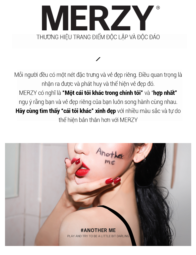MERZY là thương hiệu make up chuyên nghiệp của công ty Genuine Me.factory Hàn Quốc với tiêu chí hướng đến vẻ đẹp riêng biệt và cá tính độc lập bên trong mỗi cá thể. Các sản phẩm makeup của Merzy mang phong cách thời thượng, năng động giúp thương hiệu Merzy nhanh chóng nổi tiếng trên khắp Hàn Quốc, lan sang thị trường Châu Á. Giá thành học sinh và chất lượng đảm bảo cũng được đánh giá rất tích cực nên các sản phẩm của Merzy đang trở thành từ khóa hot mà rất nhiều bạn gái tại Việt Nam tìm kiếm và tin dùng
