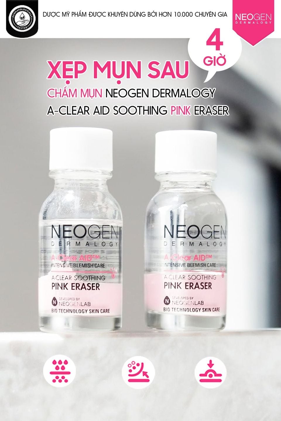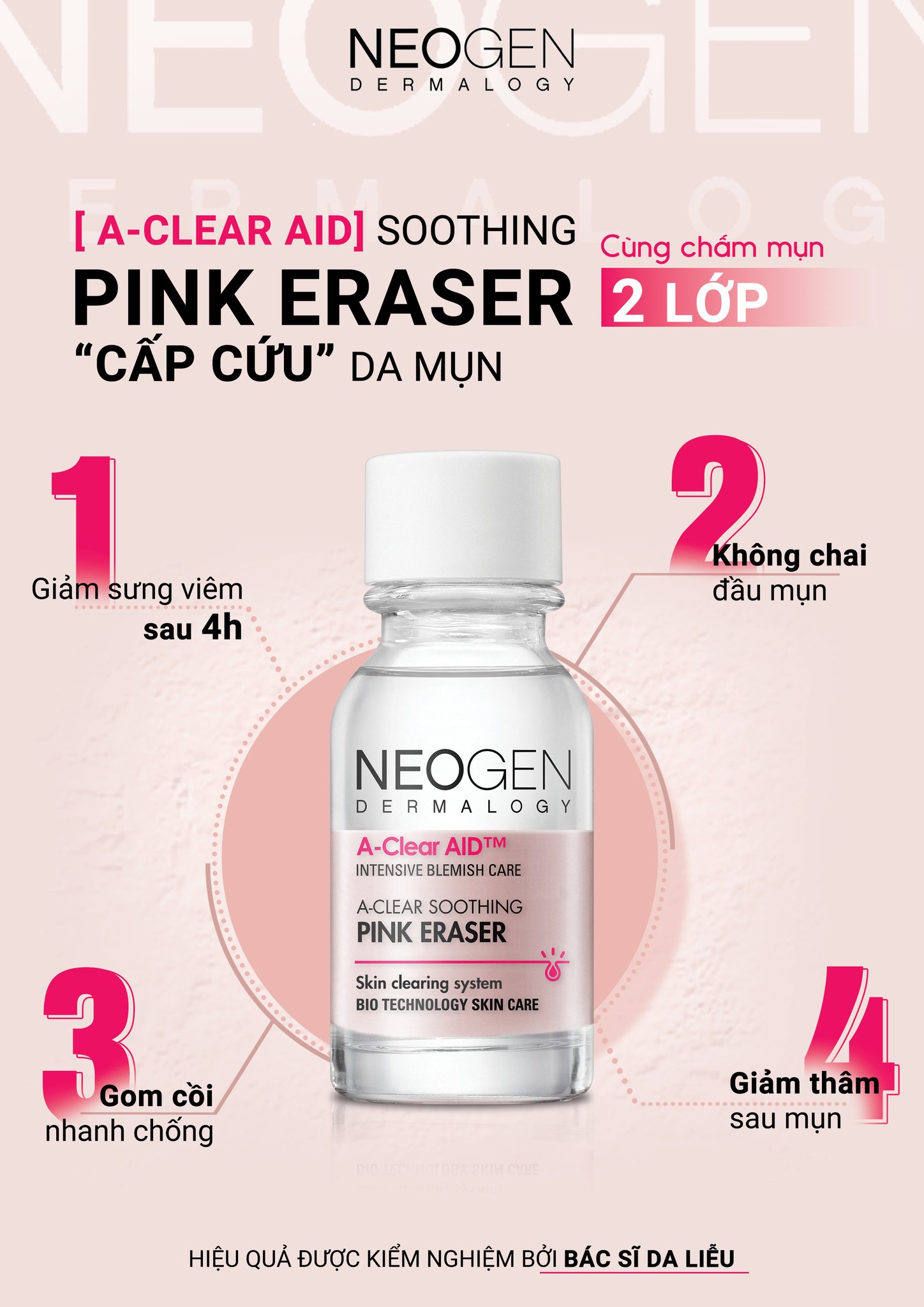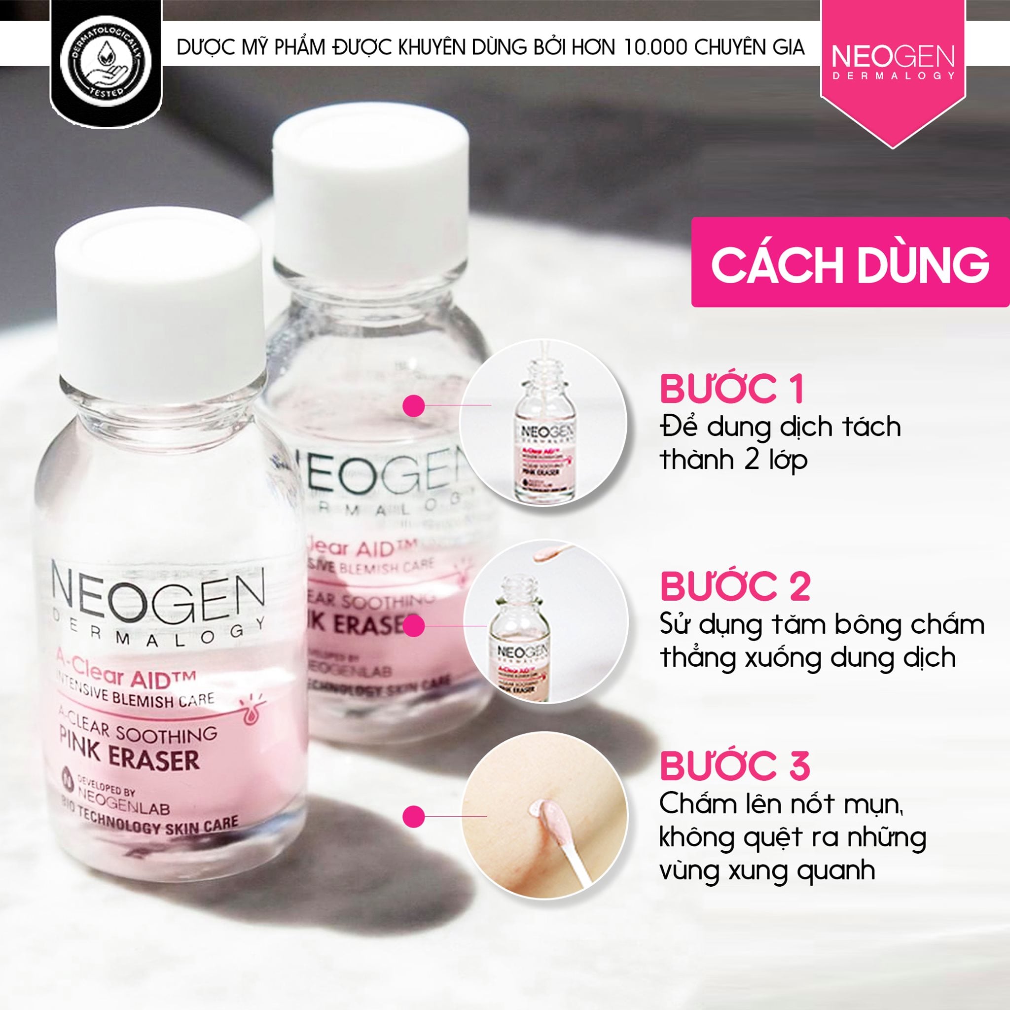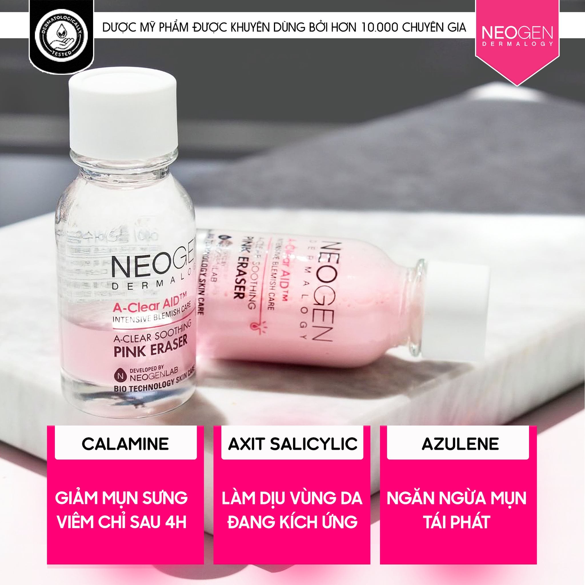 - Dung Dịch Chấm Mụn, Giảm Sưng Viêm Cấp Tốc Neogen Dermalogy A-Clear Soothing Pink Eraser với thành phần chính chứa Calamine là hợp chất giữa Sắt(III) Oxit và Kẽm Oxit có màu hồng tự nhiên thích hợp sử dụng cho da nhiều mụn trứng cá, mụn sưng đỏ với khả năng tiêu viêm và gom còi mụn nhanh chóng.