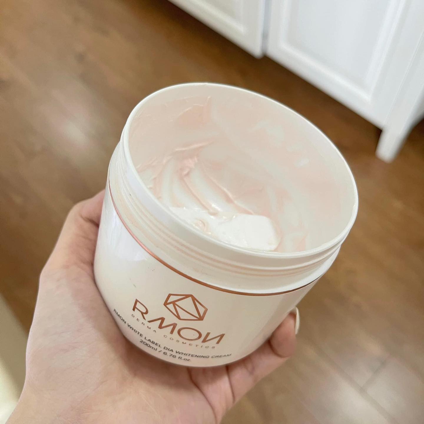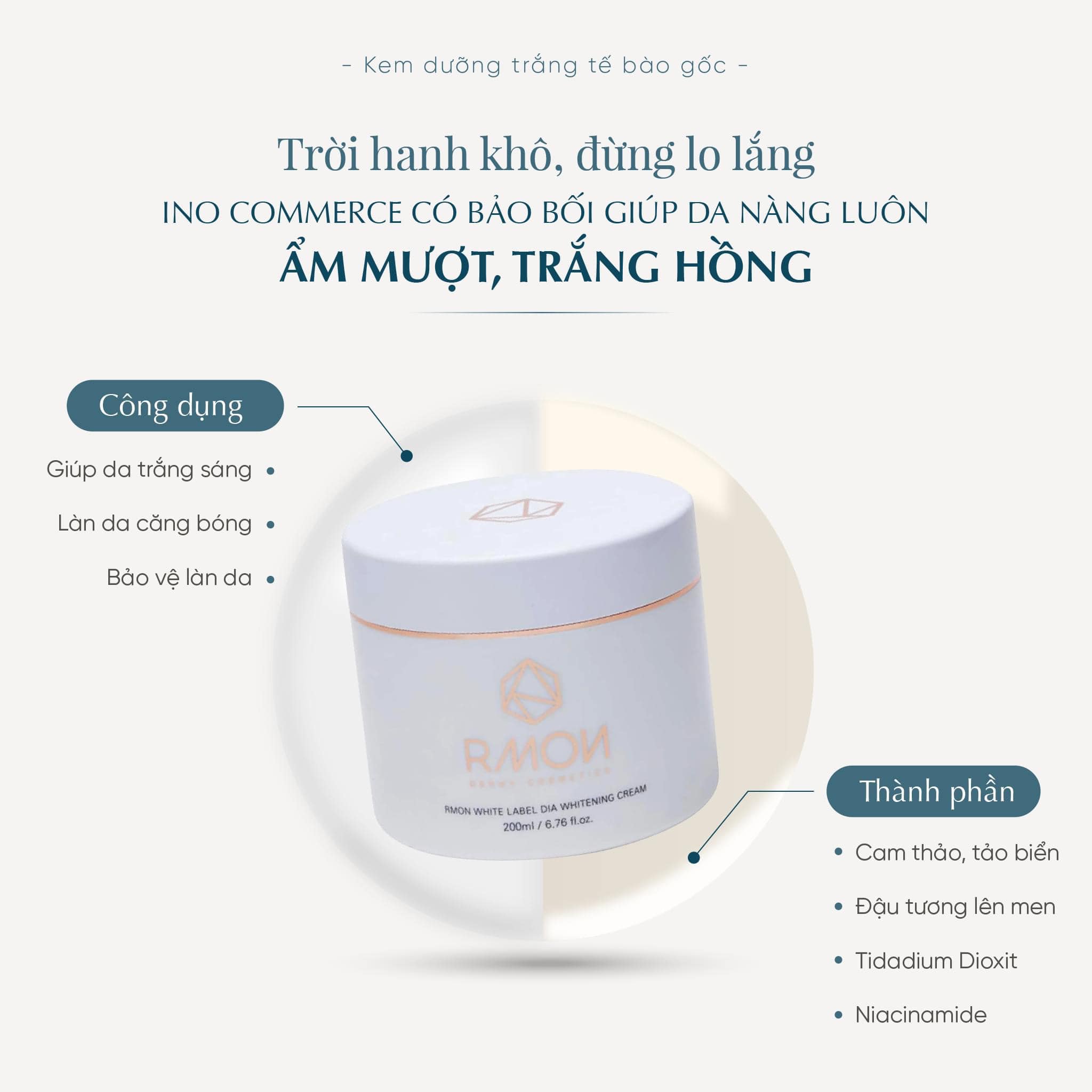 - Rmon White Label Dia Whitening Cream chiết xuất chủ yếu từ Tế bào gốc sống - Thành phần đặc biệt, công dụng cụ thể tái tạo da tới tận từng lớp hạ bì. Cơ chế hoạt động là tăng cường tái tạo tế bào mới trắng hồng và loại bỏ các hắc tố gây sạm da hay khiến da không đều màu. Cải thiện các dấu hiệu lão hóa ở body như làm mờ các đốm nâu, sạm nám. Làm trắng da toàn thân, kích thích tái tạo tế bào da mới trắng hồng rạng rỡ giúp loại bỏ hắc sắc tố gây sạm nám, làm da không đều màu.