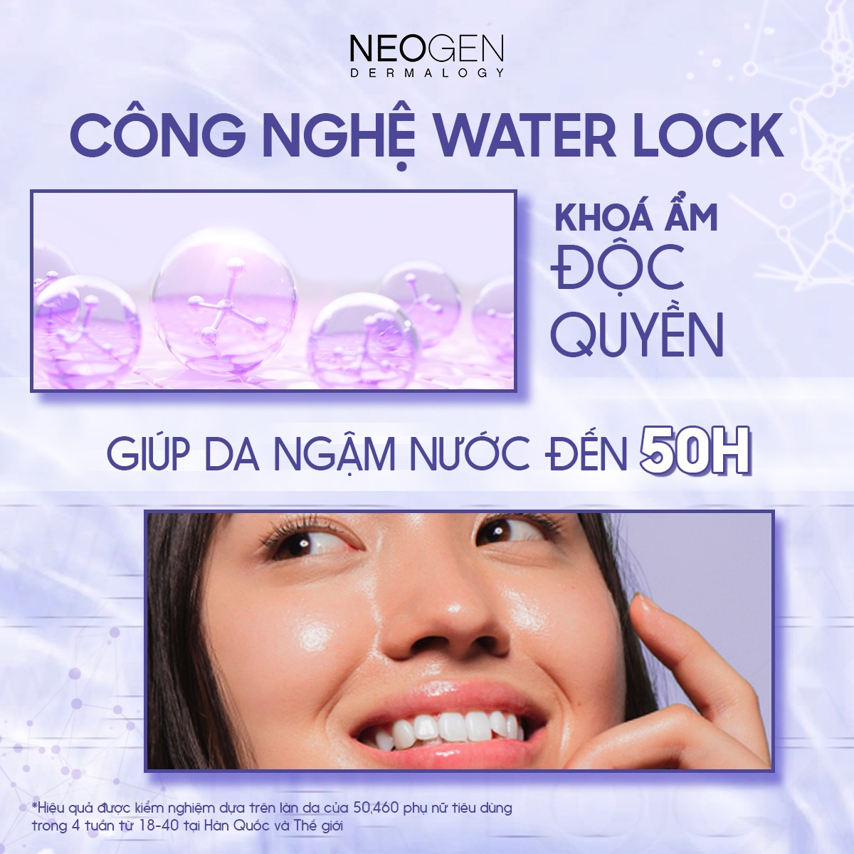 - Công nghệ khóa ẩm độc quyền Water Lock với 5% HA được chia thành 6 loại kích thước Nano khác nhau giúp thẩm thấu vào từng lớp tế bào, cấp nước vượt trội lên đến 50 giờ, mang lại làn da căng mướt mịn màng.