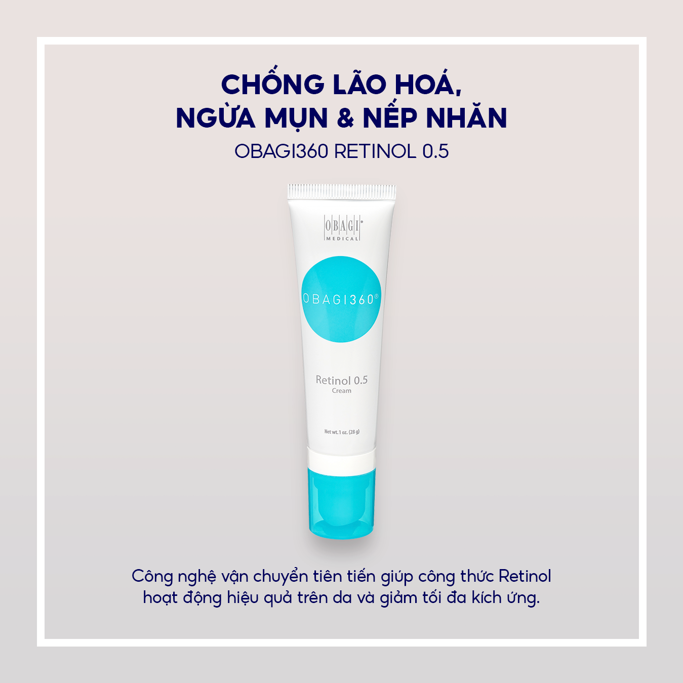 - Với hàm lượng retinol 0.5 là một dạng vitamin A đặc thù có khả năng chống lão hóa, làm mịn và trẻ da bất ngờ có trong kem dưỡng da trẻ hóa, ngừa mụn Obagi Retinol 0.5 giúp sản phẩm là lựa chọn thích hợp cho những làn da nhăn nheo, sạm nám, kém sức sống do lão hóa và chịu tổn thương từ tác động môi trường.