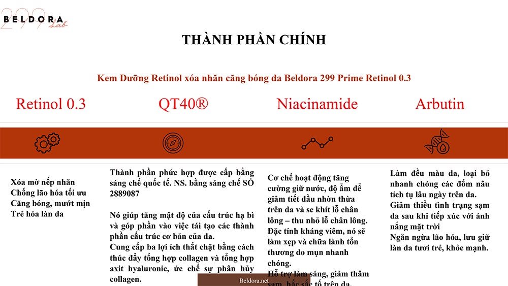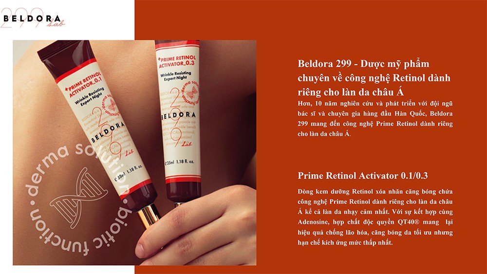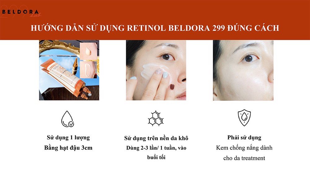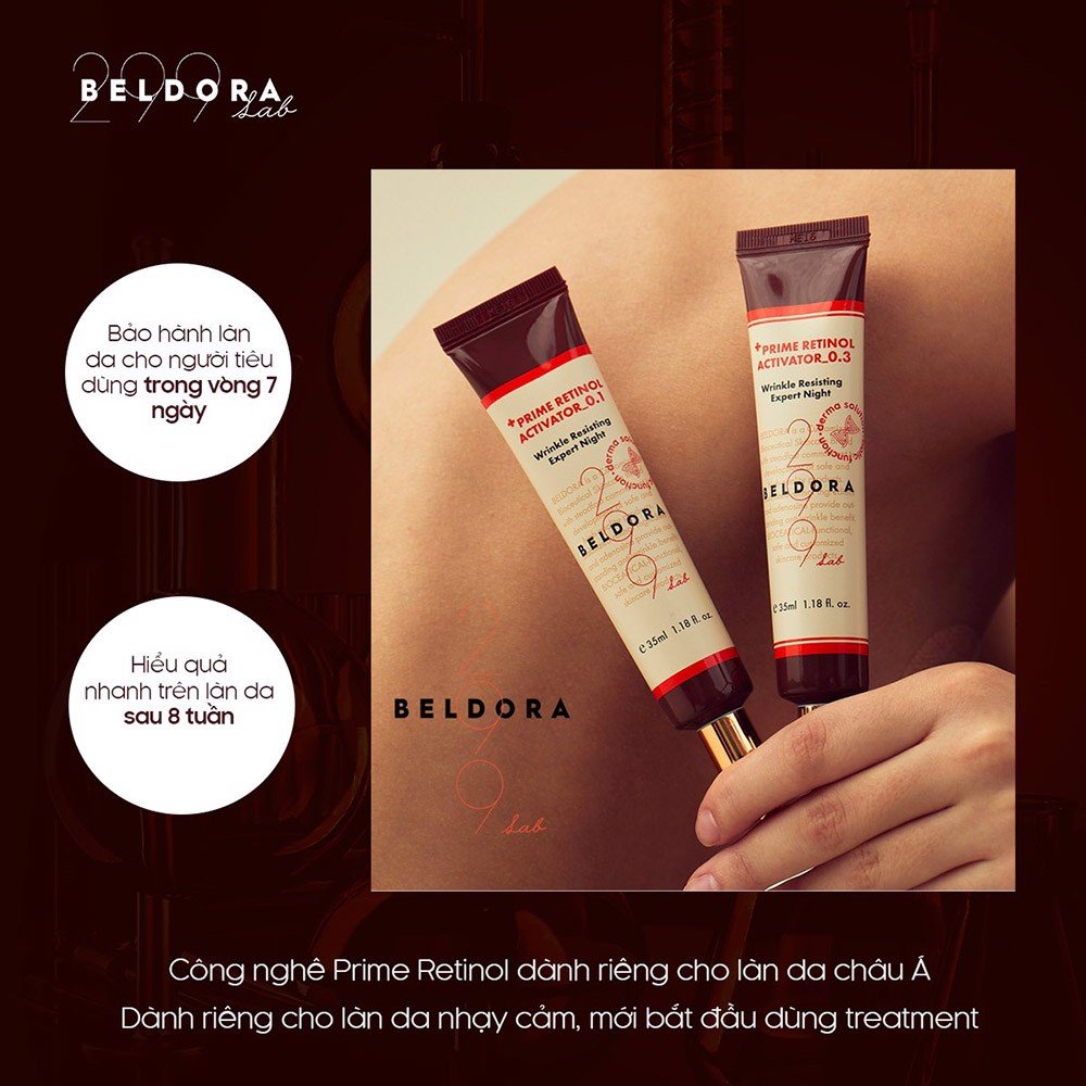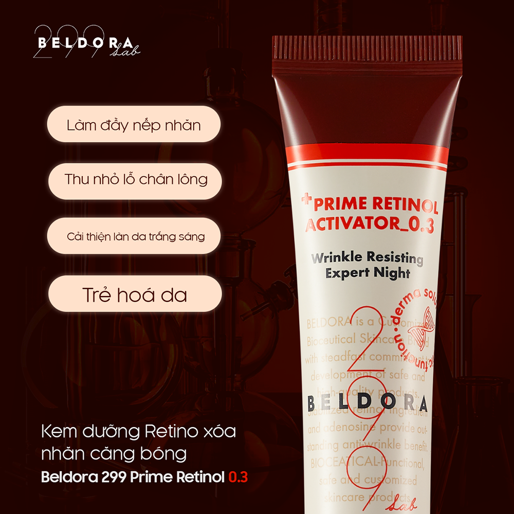 - Kem Dưỡng Retinol Xóa Nếp Nhăn, Căng Bóng Da Beldora 299 Prime Retinol Activator 0.3 với công thức Retinol 0.3 có chức năng tái sinh tế bào, ngăn ngừa lão hóa da như nếp nhăn, thâm nám, tàn nhang,... kích thích sản sinh collagen từ đó mang lại làn da tươi trẻ.