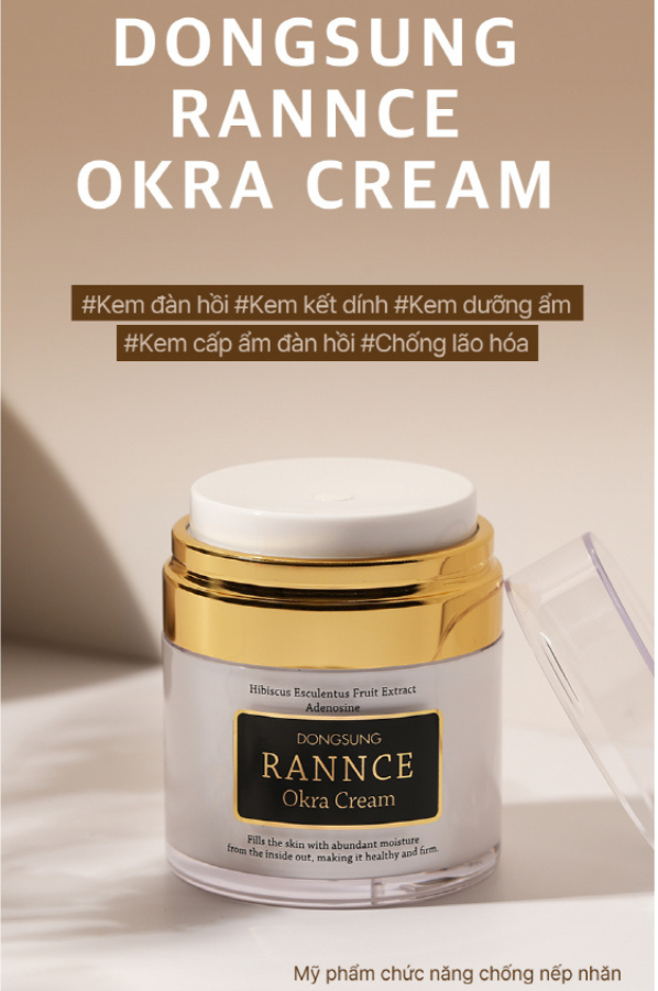 Kem Dưỡng Sáng Trắng, Chống Lão Hóa Dongsung Rannce Okra Cream chiết xuất đậu bắp Okra Fruit Extract (50.000ppm) kết hợp cùng Adenosine có khả năng cung cấp dưỡng chất và chất chống oxy hóa cho da, giúp làm sáng da, làm giảm các dấu hiệu lão hóa. Sản phẩm thiết kế dành cho mọi loại da cần dưỡng sáng, đặc biệt là da trong giai đoạn tiền lão hóa.