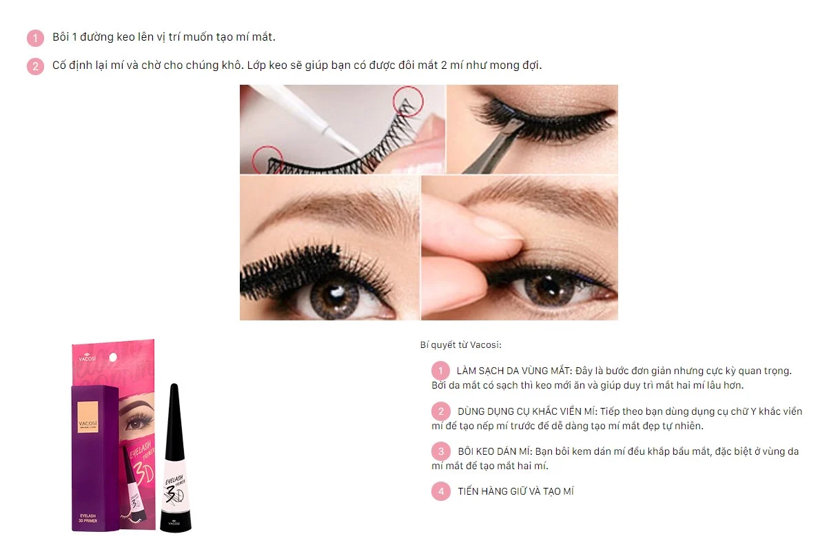 Keo dán mi Vacosi được nhiều chuyên gia trang điểm tin dùng vì độ bền đẹp và bám dính lâu. Sử dụng keo dán mi VACOSI giúp lông mi giả và lông mi thật kết hợp với nhau tạo thành làn mi dài, cong vuốt một cách tự nhiên