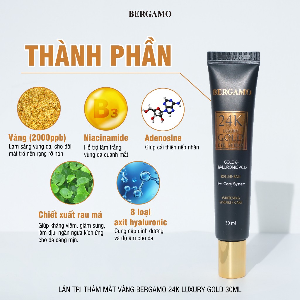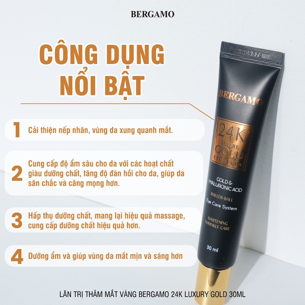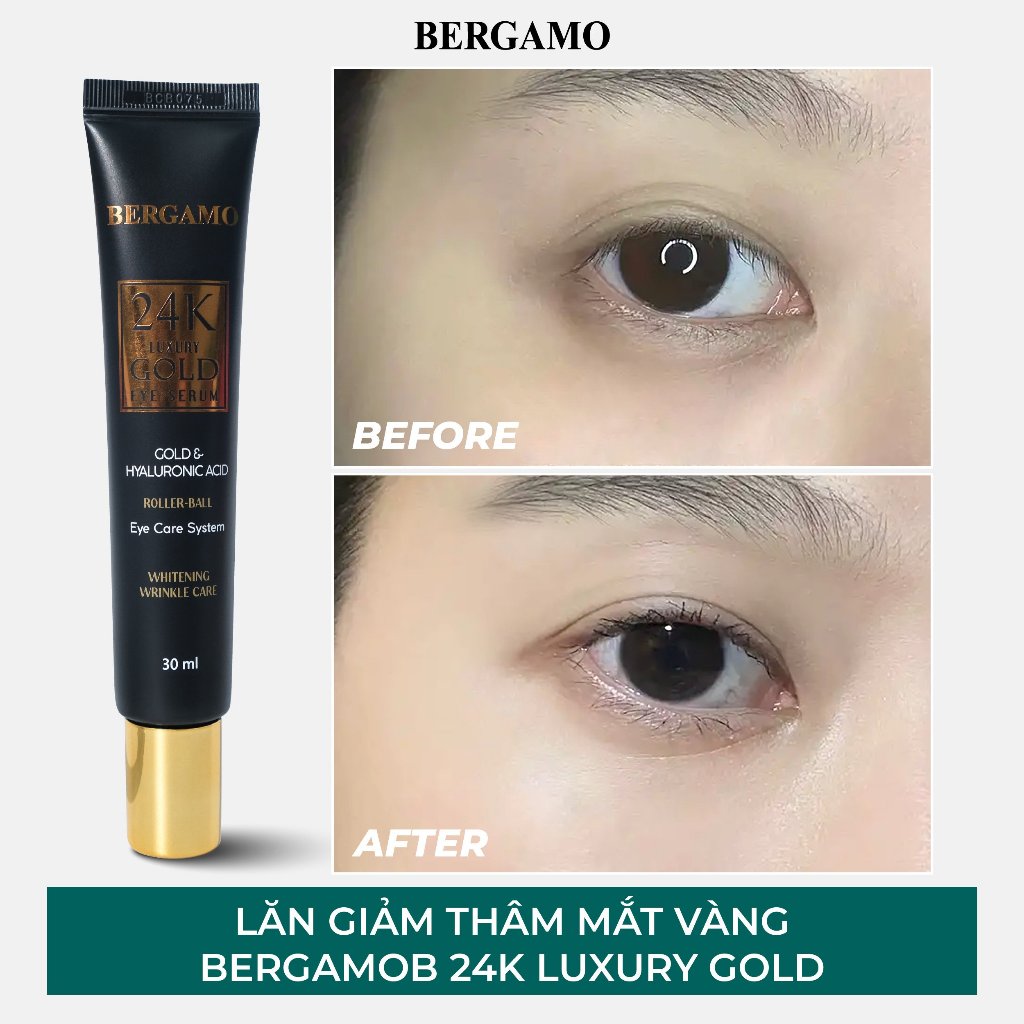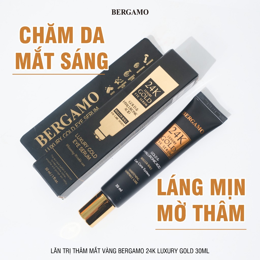 Lăn giảm thâm mắt vàng Bergamo 24K Luxury Gold Eye Serum 30ml sẽ giải quyết vấn đề thâm mắt cho bạn. Lăn giảm thâm mắt có chứa thành phần 24K và 8 loại axit hyaluronic giúp tăng cường độ đàn hồi và chăm sóc nếp nhăn quanh mắt, cải thiện vùng da mắt được sáng hơn.