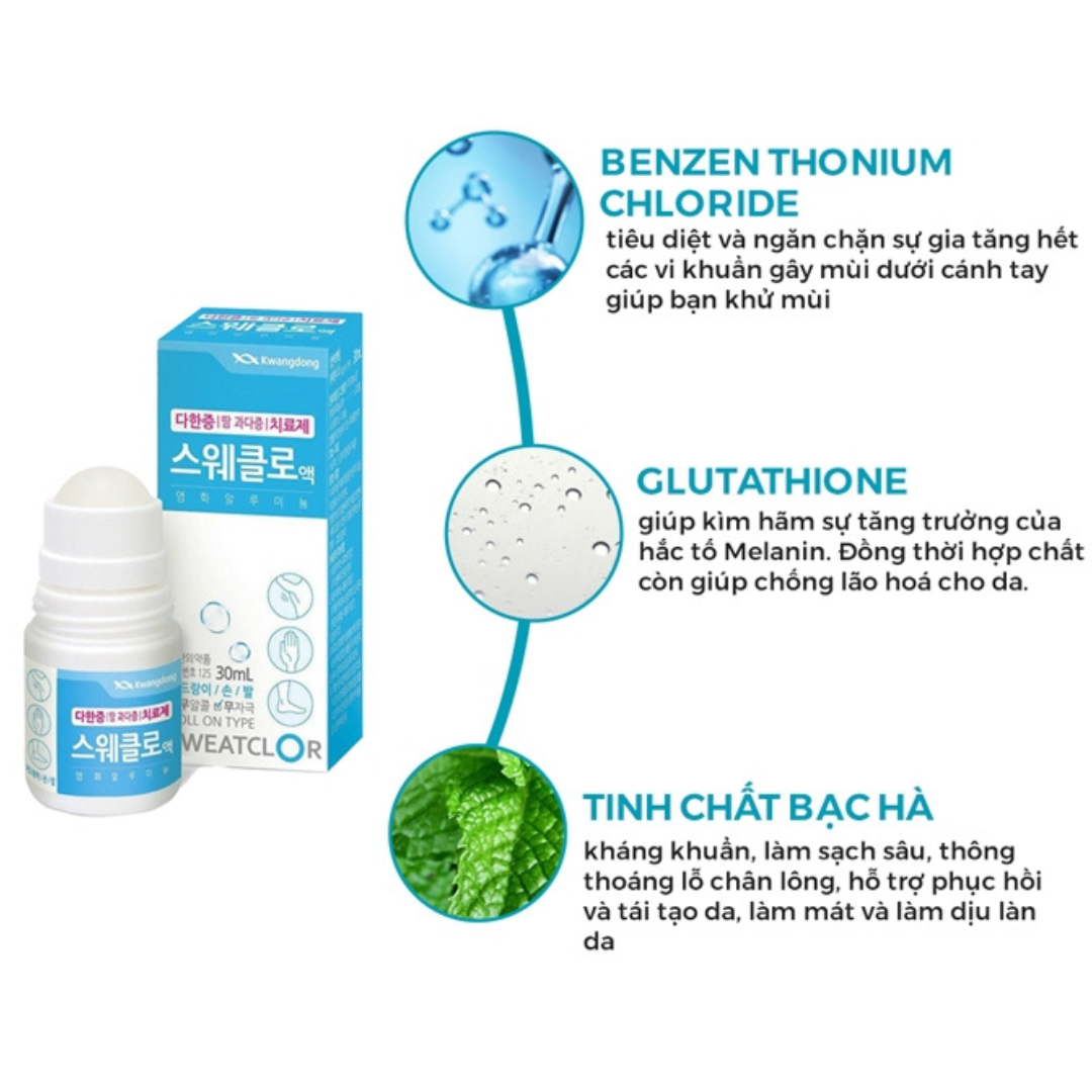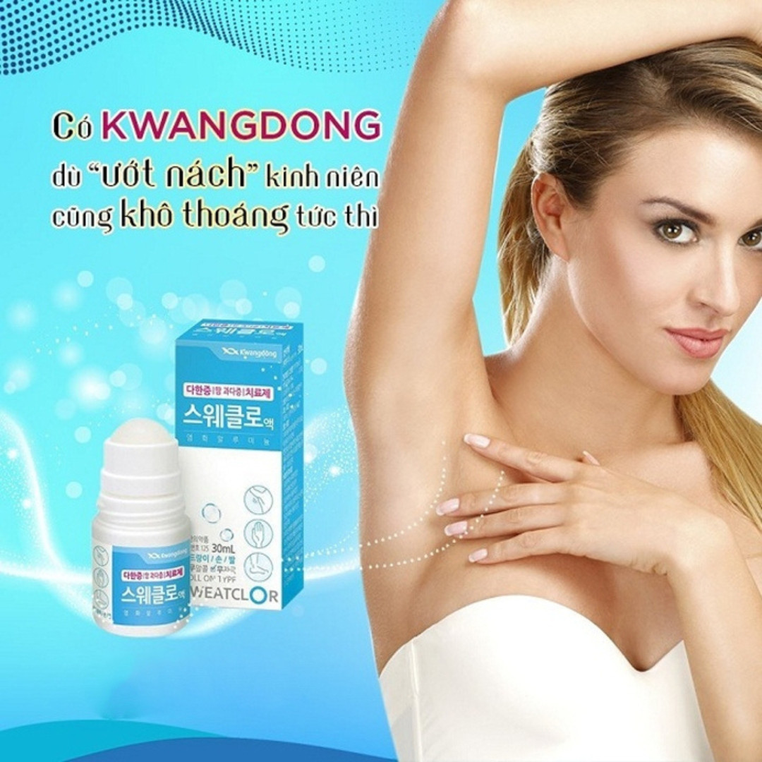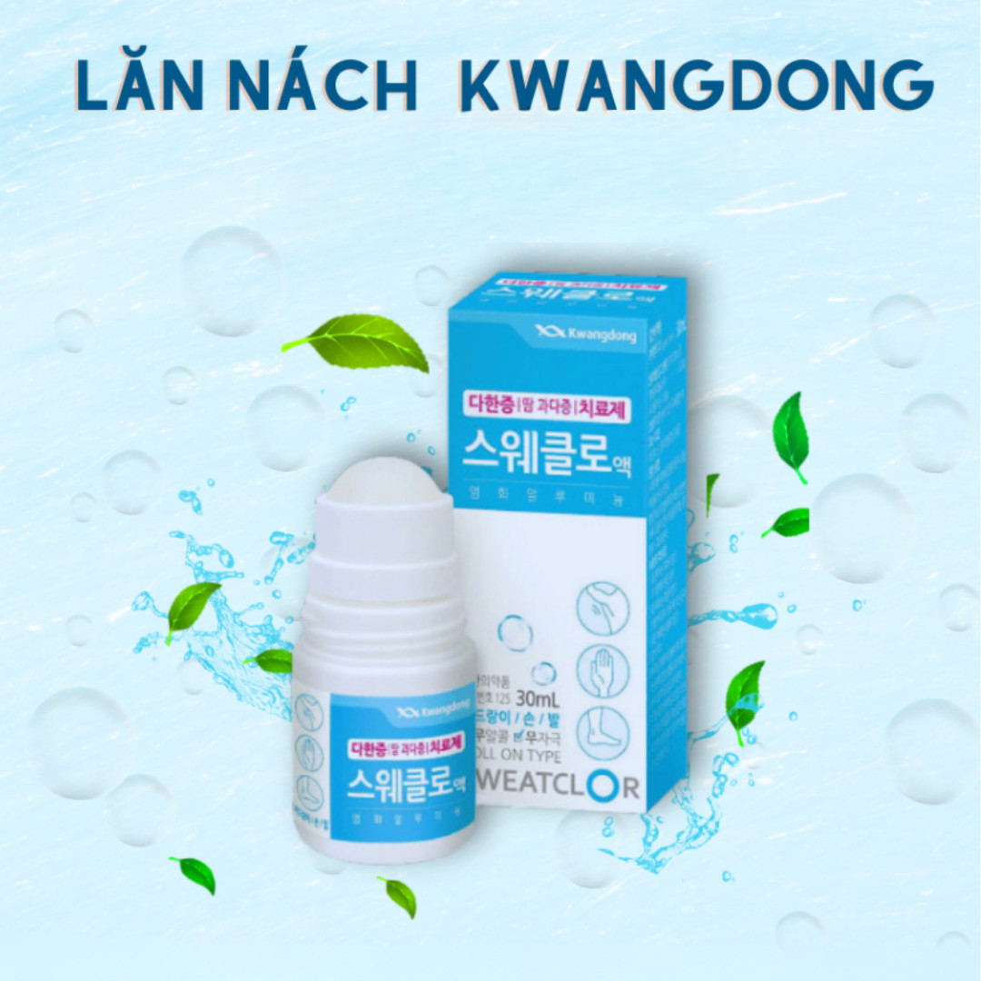 Lăn Khử Mùi Giảm Mồ Hôi Kháng Khuẩn Kwangdong Sweatclor Hàn Quốc 30ml.Lăn Khử Mùi Kwangdong Hàn Quốc 30ml được coi là một trong những sản phẩm khử mùi tốt nhất tại Hàn Quốc. Đây là một sản phẩm đa năng, có thể khử mùi đồng thời cho cả nách, tay và chân. Sản phẩm có thành phần chính là Aluminum Chloride, một hoạt chất có khả năng điều tiết tuyến mồ hôi, giúp giảm tiết mồ hôi trên da, đồng thời giúp khử mùi hiệu quả cho vùng da ở các khu vực này. Lăn Khử Mùi Kwangdong có khả năng ngăn mồ hôi và khử mùi lên đến 72 giờ, cho bạn tự tin khi giao tiếp và tham gia các hoạt động nơi đông người.