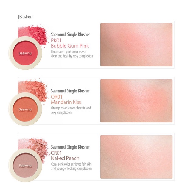 The Saem Single Blusher sở hữu những tone màu nổi bật, phù hợp với nhiều loại phong cách trang điểm, tạo nên lớp makeup hoàn hảo, hiện tại Garden Shop có những tone màu sau: