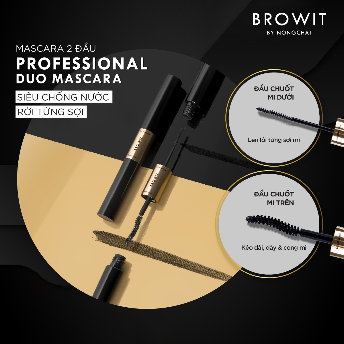 Mascara 2 Đầu Làm Dài, Cong Mi Browit By NongChat Professional Duo Mascara có 2 đầu phục vụ cho việc chuốt mi trên và mi dưới vô cùng tiện lợi mà không sợ bị lem hay vón cục; áp dụng công nghệ water proof với khả năng chống nước, chống mồ hôi, giữ cho bạn đôi mắt xinh lung linh cả ngày mà không sợ lem nhem xấu xí.