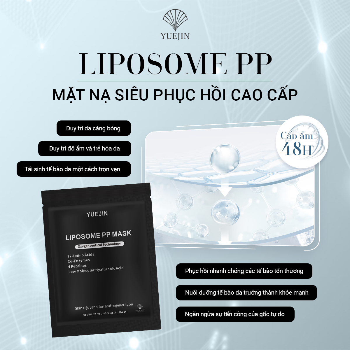 - Mặt Nạ Phục Hồi, Cấp Ẩm Đa Tầng Yuejin Liposome PP Mask giúp làm săn mịn bề mặt da, giảm thiểu dấu vết khô trên bề mặt, thúc đẩy loại trừ tạp chất và mụn tắc nghẽn tự động từ trong ra ngoài da, làm bề mặt da mượt.