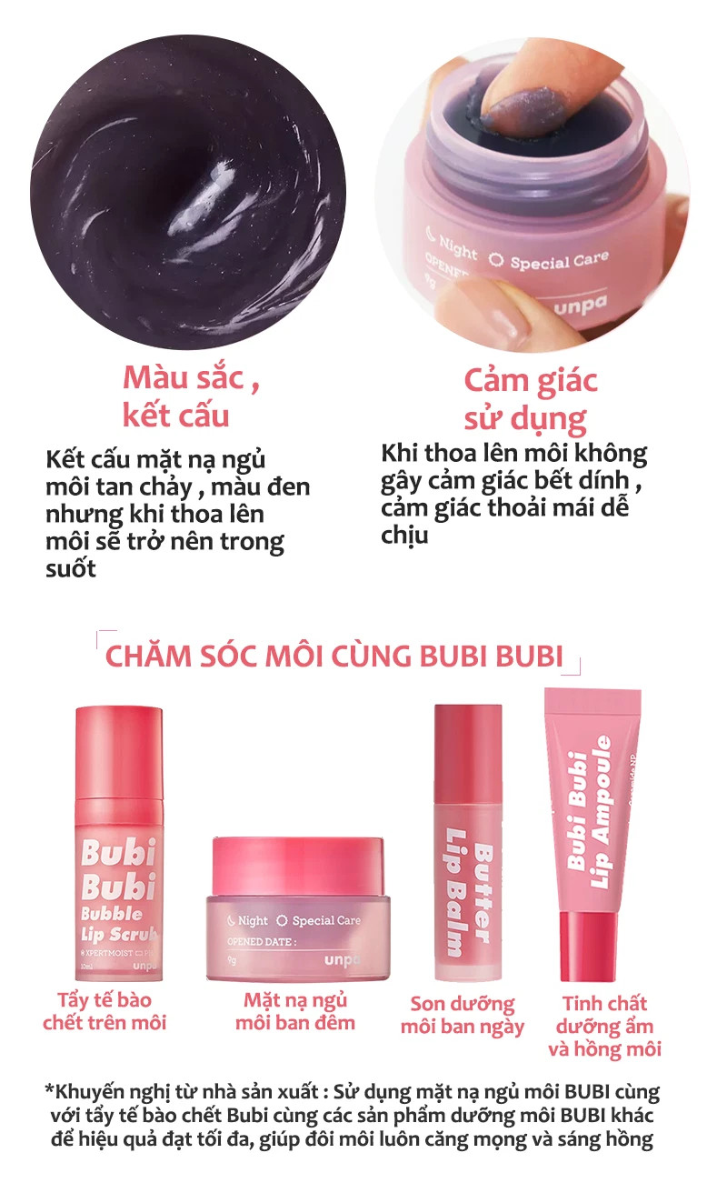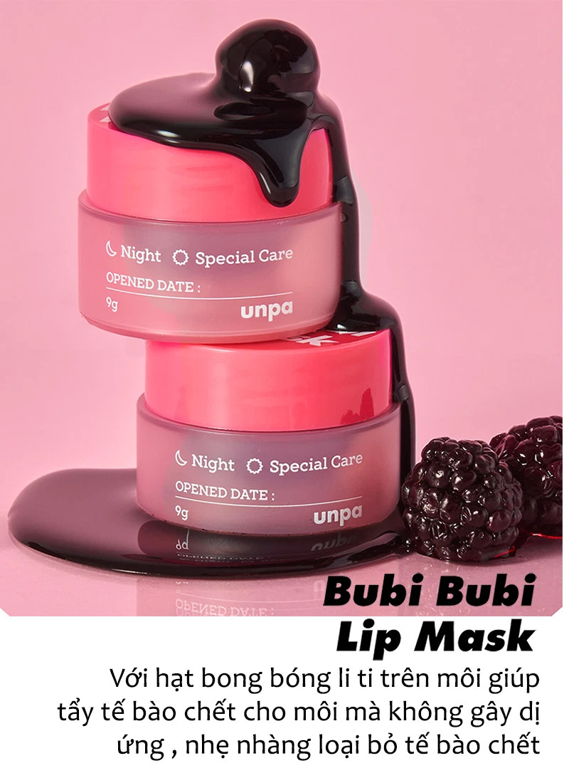 Mặt Nạ Ngủ Môi Dưỡng Ẩm Chống Lão Hóa Unpa Bubi Bubi Lip Mask là mặt nạ ngủ dưỡng môi thuộc thương hiệu Unpa với công thức dưỡng ẩm đặc biệt từ "Black Food Complex" - thực phẩm đen cùng với các thành phần hỗ trợ chống lão hóa giúp chăm sóc chuyên biệt, phục hồi cho đôi môi trở nên ẩm mịn và căng mọng vào sáng hôm sau.