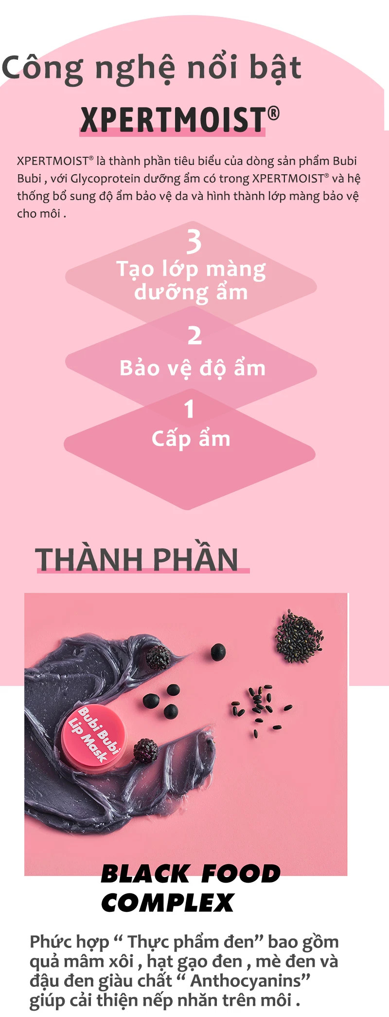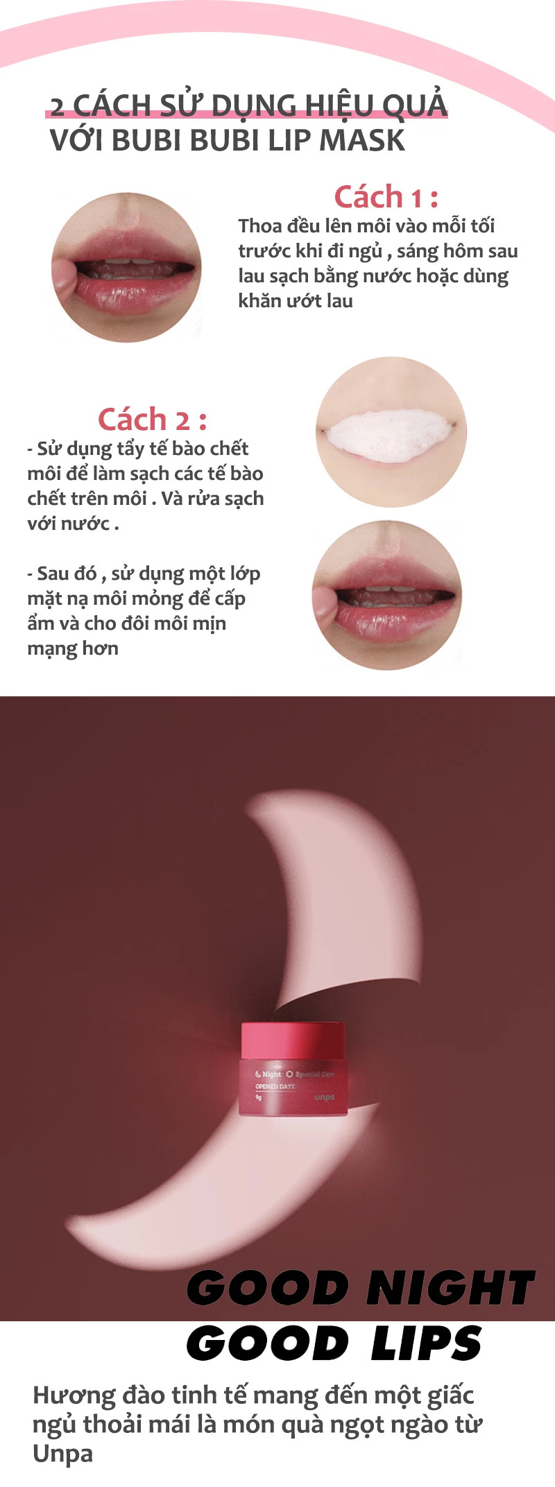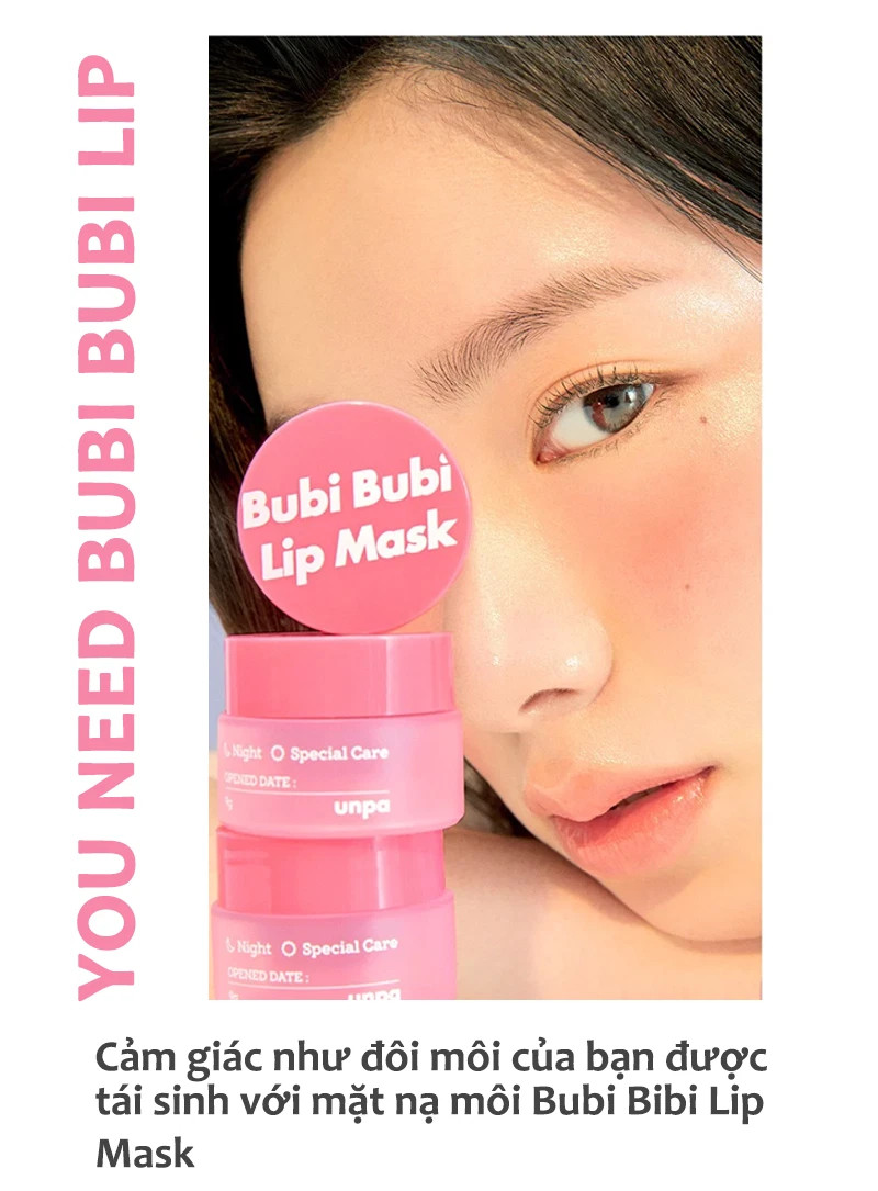 - Mặt Nạ Ngủ Môi Dưỡng Ẩm Chống Lão Hóa Unpa Bubi Bubi Lip Mask với công thức sử dụng công nghệ độc quyền XPERTMOIST® với Glycoprotein dưỡng ẩm có trong XPERTMOIST® và hoạt động theo 3 hệ thống tạo màng dưỡng ẩm - bảo vệ độ ẩm - cấp ẩm giúp phục hồi đôi môi mềm mại và ẩm mịn nhanh chóng hơn.
