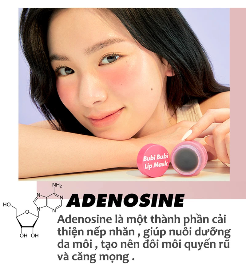- Thành phần Adenosine có tác dụng chống oxy hóa hiệu quả bằng cách cung cấp năng lượng cho bề mặt da, giúp cải thiện đáng kể độ mịn của môi và giảm độ sâu của nếp nhăn trên môi.