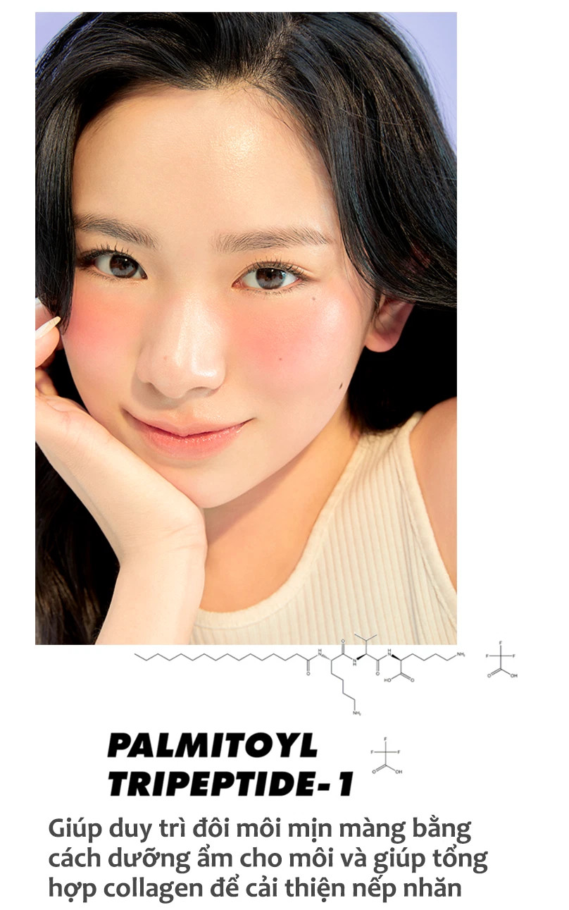 - Kết hợp cùng thành phần Palmitoyl Tripeptide-1 có khả năng kích thích sản sinh collagen trong da giúp phục hồi vẻ tươi tắn vốn có của đôi môi.