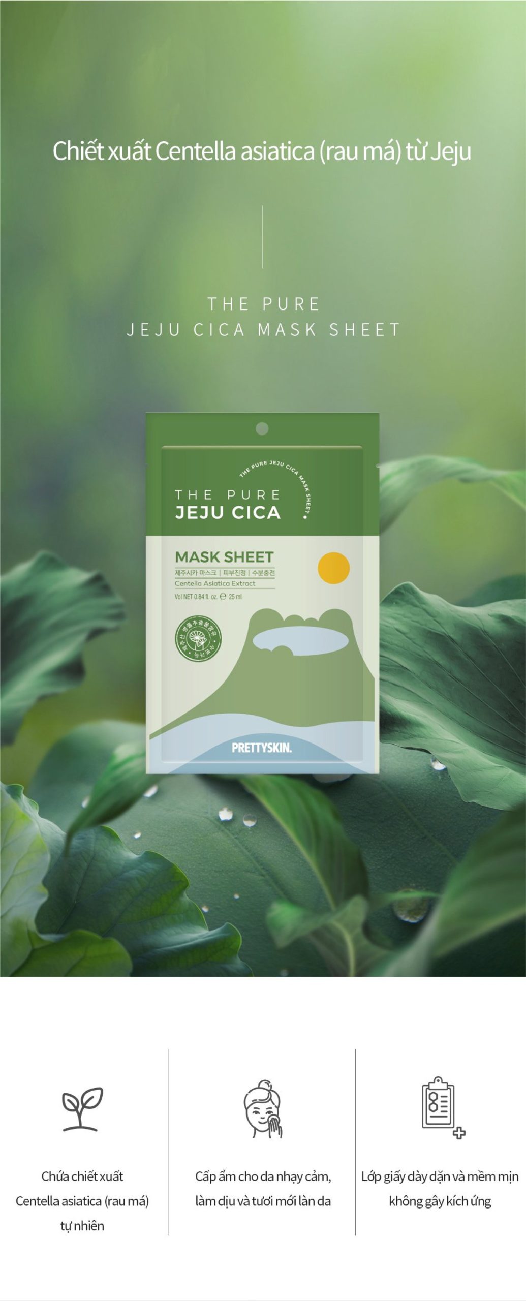 Mặt Nạ Rau Má Pretty Skin The Pure Jeju Cica Mask Sheet đến từ Pretty Skin - thương hiệu mỹ phẩm nổi tiếng hàng đầu tại xứ sở Hàn Quốc. Với chiết xuất từ rau má có khả năng làm dịu và khôi phục làn da đang bị kích ứng, cải thiện độ ẩm, chứa chất chống oxy hóa giúp da tươi mới, rạng rỡ.